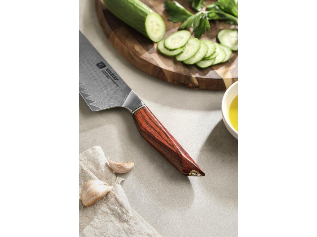 Zajímavost: XinZuo jako přední inovátor v oblasti výroby kuchyňských nožů kombinuje tradiční a nejmodernější techniky výroby. Díky jeho nejmodernější metodě vakuového tepelného zpracování mají kuchyňské nože XinZuo ve srovnání s noži vyrobenými pouze běžným tepleným zpracováním vyšší tvrdost a ostrost, též delší živostnost. Ve spojení s tradičním závěrečným ručním ostřením nožů mistry nožíři, s jejichž umem předávaným z generace na generaci se žádný stroj nemůže srovnávat, mají kuchyňské nože XinZuo i prémiovou ostrost, kterou strojově ostřené nože nedosahují.
