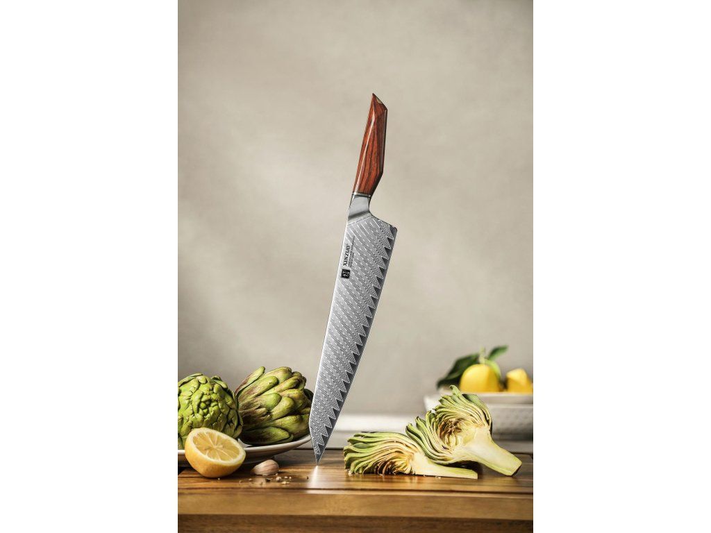 Nože z řady Xing X03 na první pohled zaujmou vlnovitým damaškovým vzorem čepele inspirovaným mořskými vlnami a italskou uměleckou elegancí – vzorem, který se mění s každým pohledem a dává každému kusu nezaměnitelný charakter. K tomu se přidává rukojeť z prémiového palisandrového dřeva v kosočtvercovém tvaru, která zajišťuje pevný a pohodlný úchop díky vícenásobnému ručnímu leštění a jemné textuře povrchu.