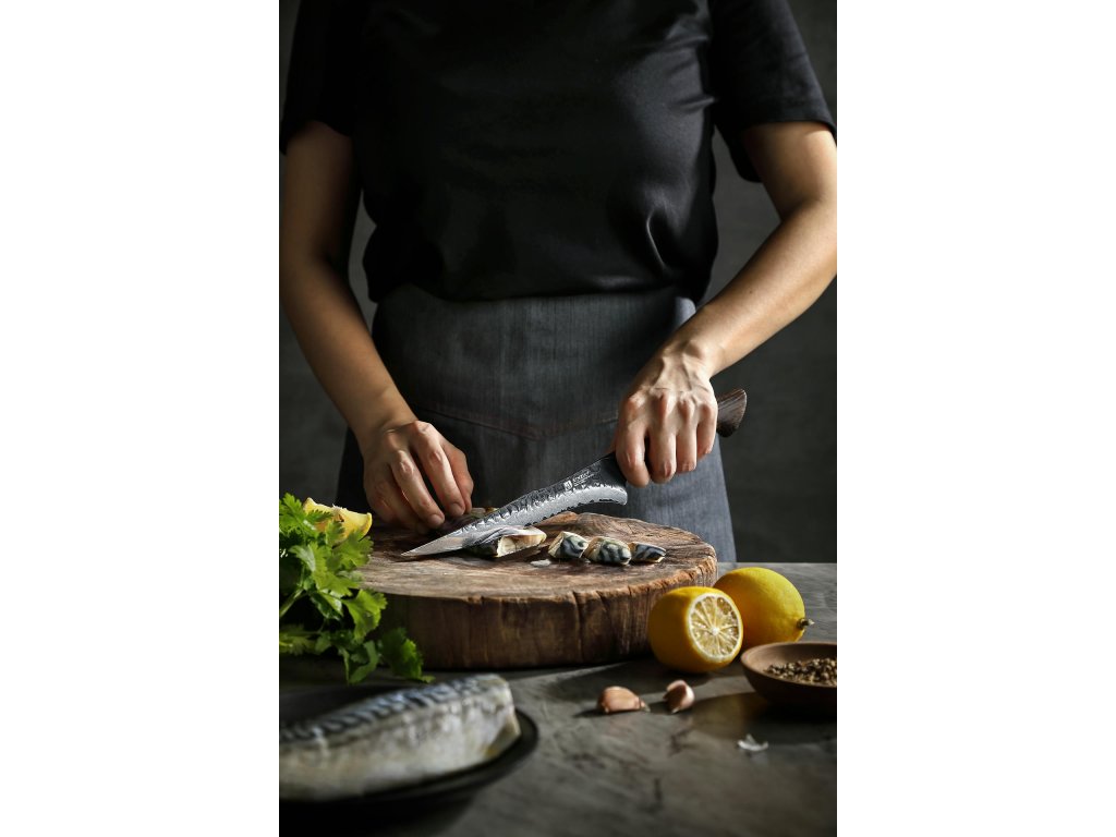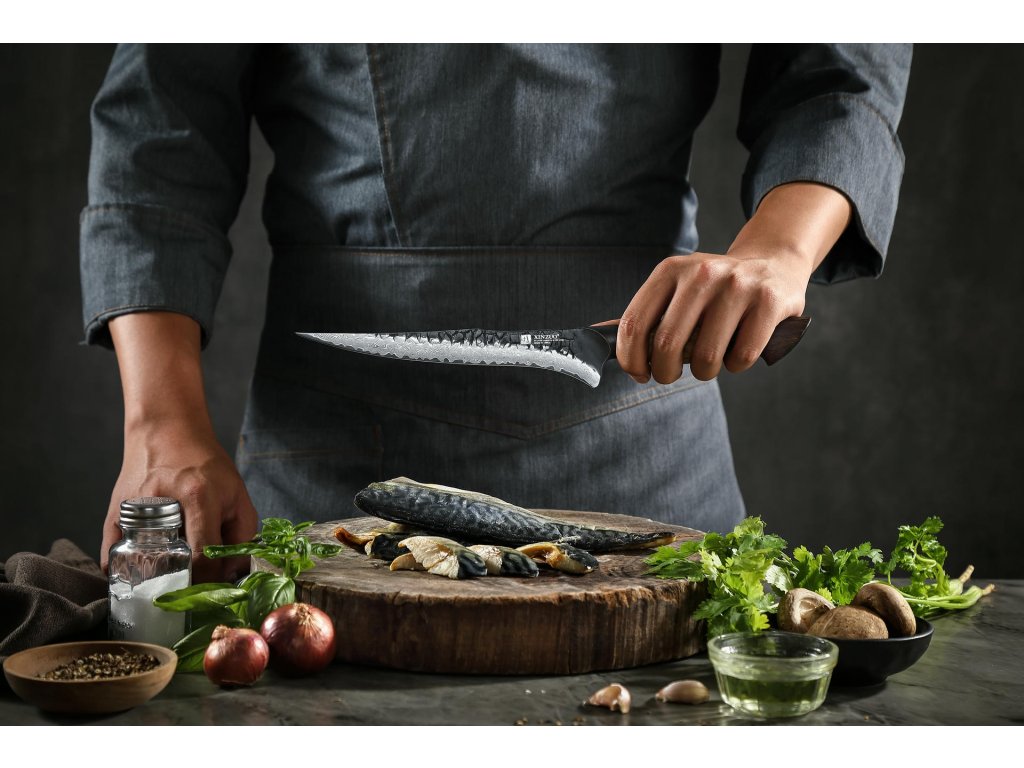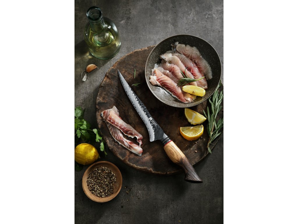 Filetovací nůž je speciálně navržený pro zpracování čerstvých a celých ryb. Jeho tenká a pružná čepel umožňuje precizní a detailní práci, která je při filetování klíčová. Díky těmto vlastnostem snadno oddělíte maso od kůže a kostí, a to s minimálními ztrátami masa. Filetovací nůž je nenahraditelný nejen při prvotním zpracování ryb, ale také při následném přesném plátkování, například při přípravě sushi nebo carpaccia.
