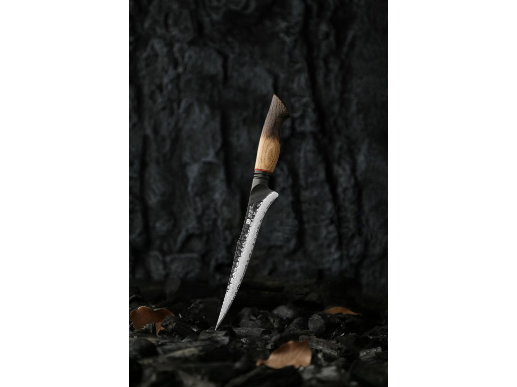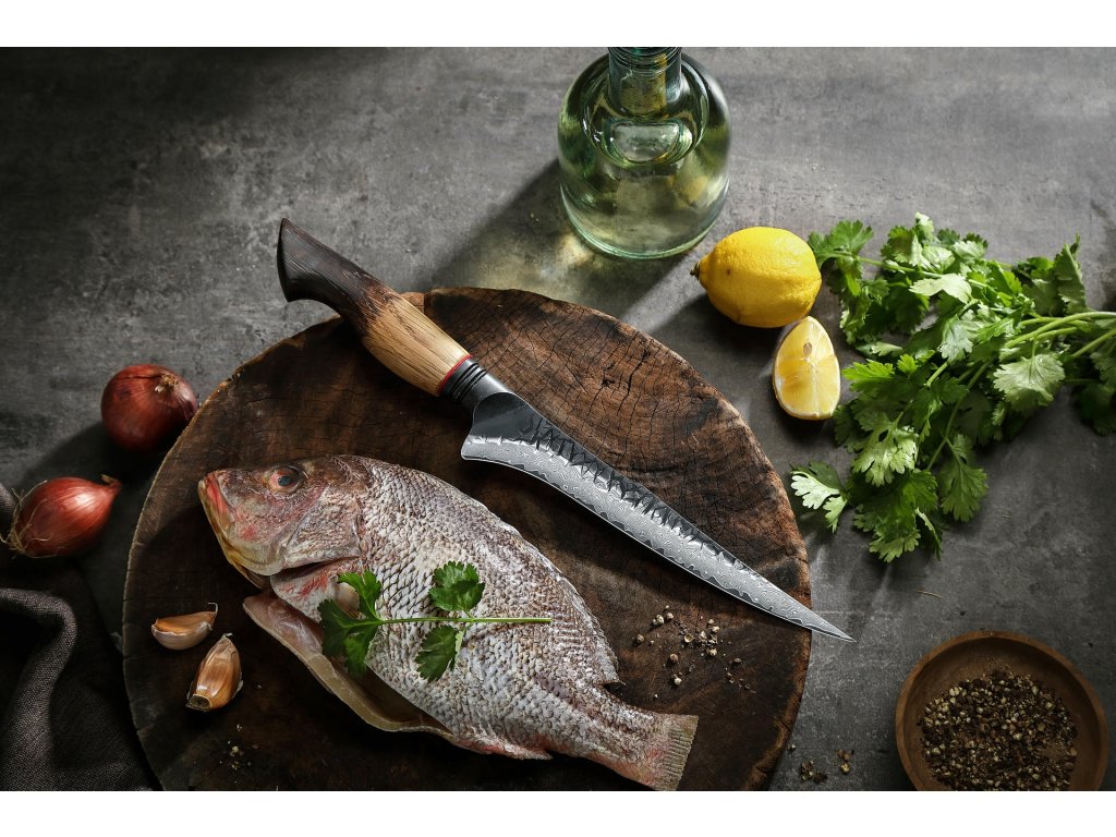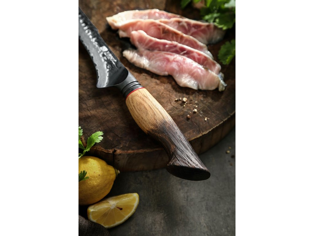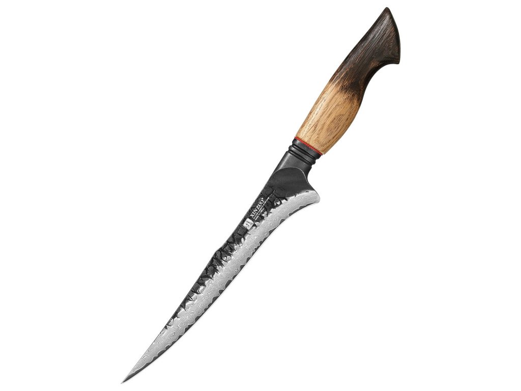 Filetovací nůž XinZuo Mo X06 7" s unikátní damaškovou čepelí a s ručně vyrobenou dubovou rukojetí, která plynule přechází od světlé hřejivé barvy ke kouřově tmavé.