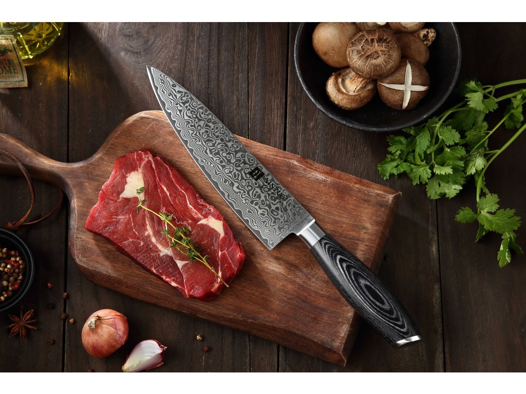 Tento šéfkuchařský nůž je vyroben z prvotřídní damaškové oceli (damascus steel), ze které se vyrábí ty nejlepší nože. Čepel nože s tvrdostí 60±2 Rockwella je vyrobena ze 67 vrstev. Kvalitní ocel spolu s tradiční technikou výroby zajišťuje dlouhou životnost nože. Povrch nože umožňuje dokonalý řez s minimem tření a lepení surovin. Rukojeť nože je vyrobena ze dřeva Pakkawood, který v čase neměkne a neudržuje zápach. Její dokonalý tvar a délka umožňuje snadné a ladné krájení bez toho, aniž by nůž z ruky vyklouzával. Barva a vzhled materiálu rukojeti nože se může oproti produktovým obrázkům mírně lišit z důvodu výroby rukojeti z jiného kusu dřeva nebo rozdílným stářím dřeva. Odstín kresby na čepeli se může také lišit, protože každý nůž má skládáním vrstev oceli unikátní vzhled.