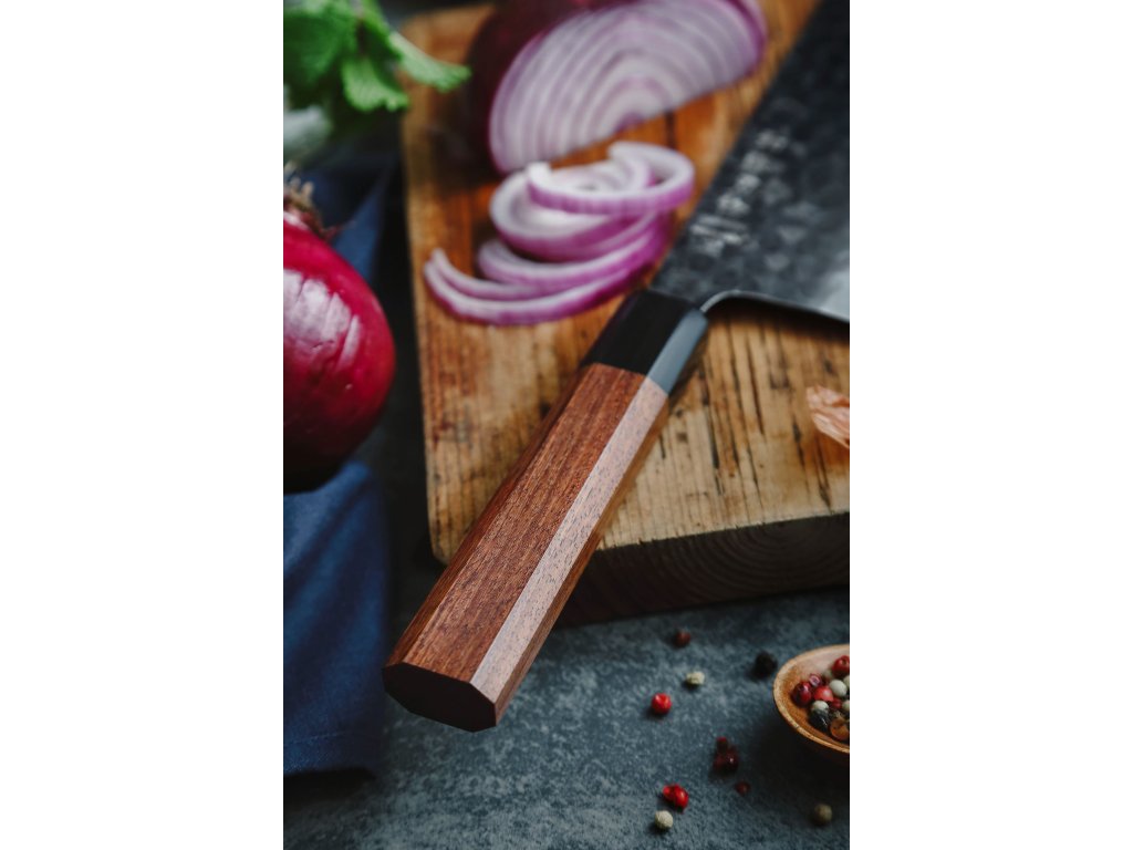 Díky léty prověřenému oktagonálnímu tvaru je tento nůž vhodný pro pohodlné krájení levou i pravou rukou. Rukojeť je vyrobena z kvalitního Rosewood dřeva, které je známé svou tvrdostí. V čase neměkne, nepraská a nevybledne. Nůž je navržen pro každodenní používání s dlouhou životností nejen čepele, ale i rukojeti. Barva a vzhled materiálu rukojeti nože se může oproti produktovým obrázkům mírně lišit z důvodu výroby rukojeti z jiného kusu dřeva nebo rozdílným stářím dřeva.
