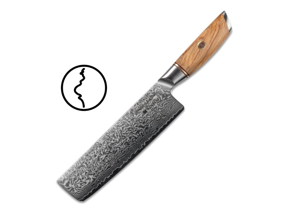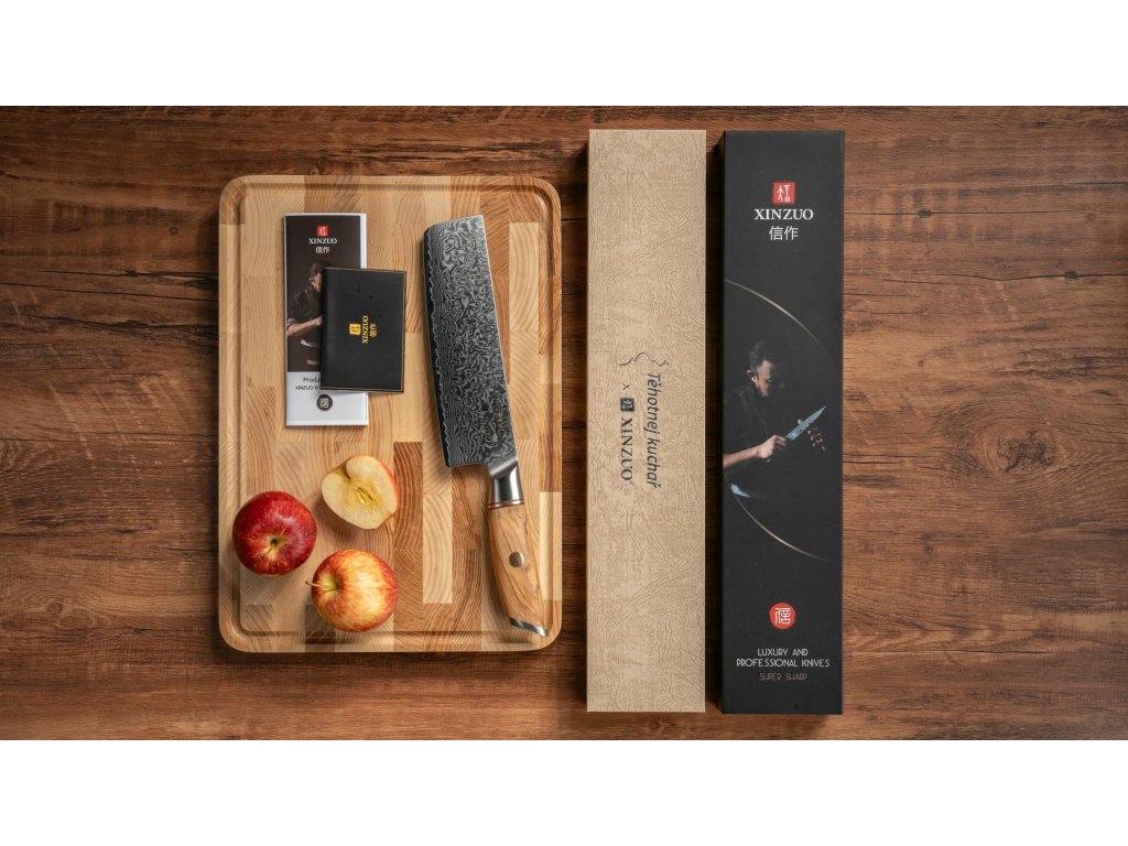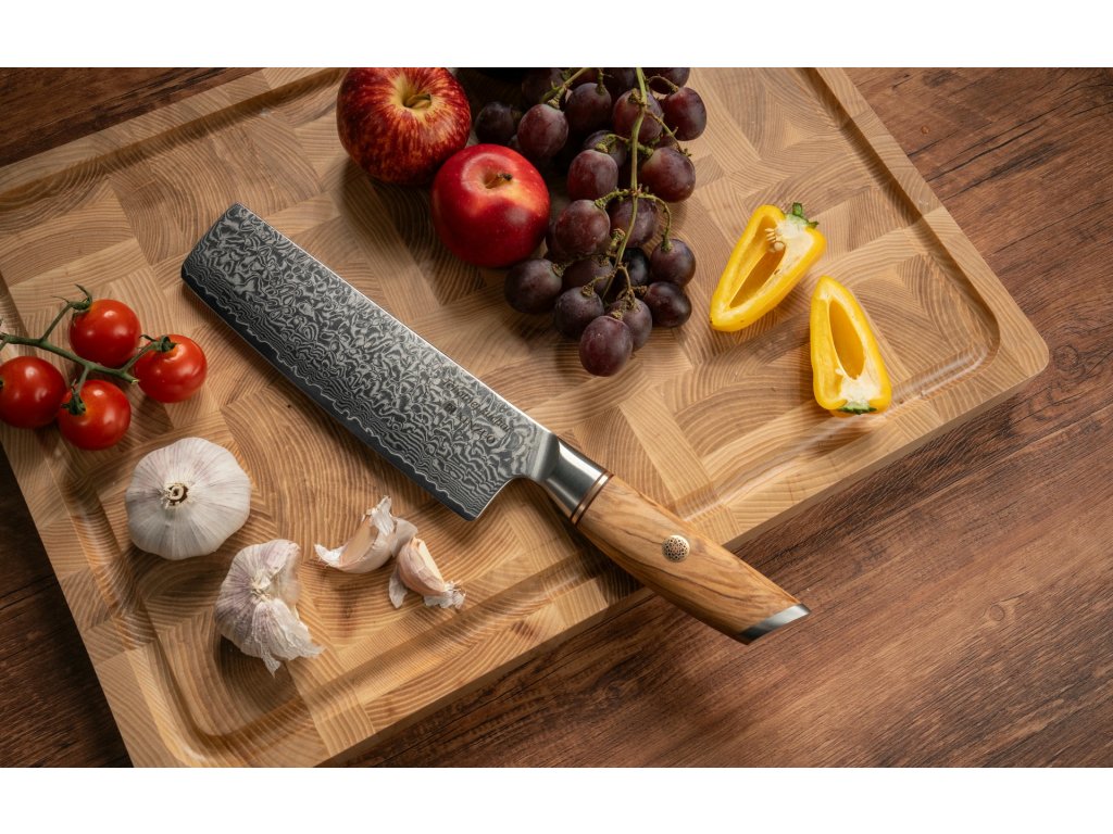 Prémiový nakiri nůž XinZuo Lan B37 7" z řady Těhotnej kuchař je designovým skvostem s damaškovou čepelí a rukojetí z olivového dřeva.
