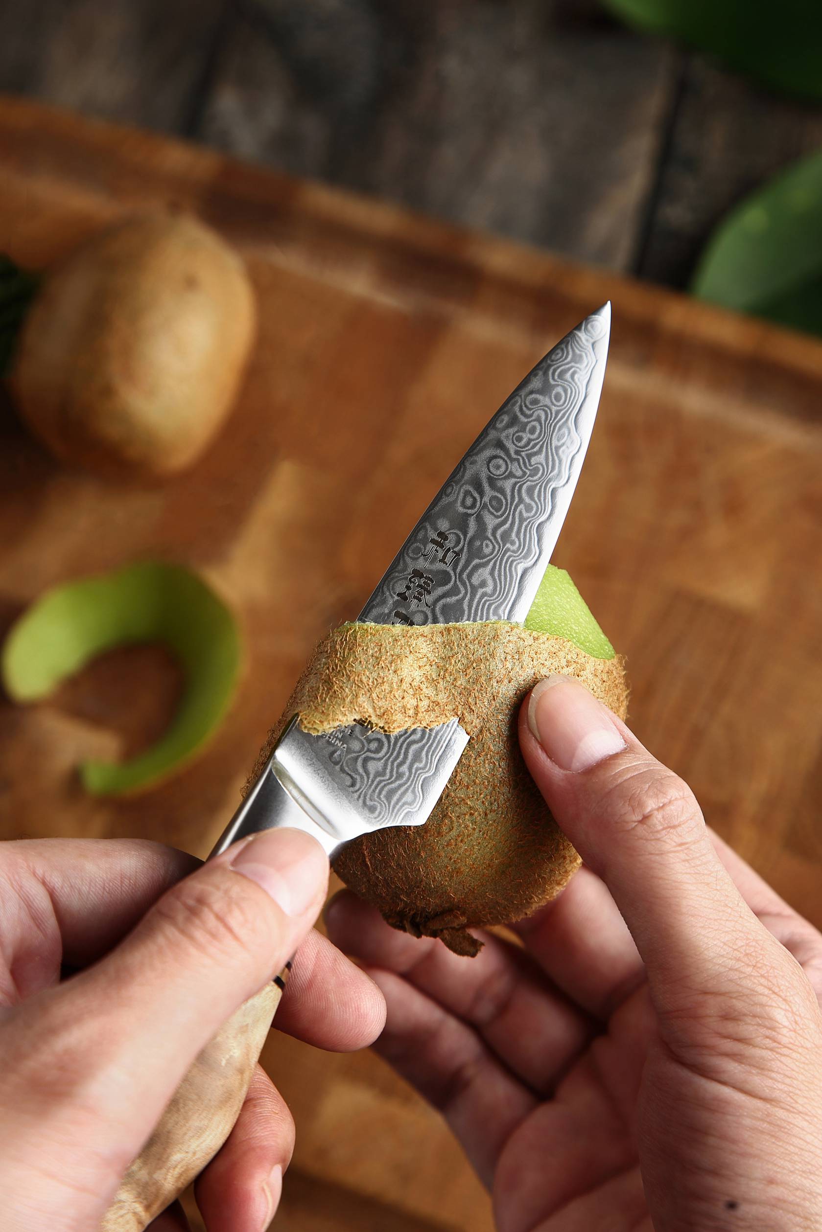 Nůž na loupání HEZHEN Master B30 3.5" s čepelí z prémiové damaškové oceli a elegantní ergonomickou rukojetí pro snadné loupání ovoce a zeleniny.