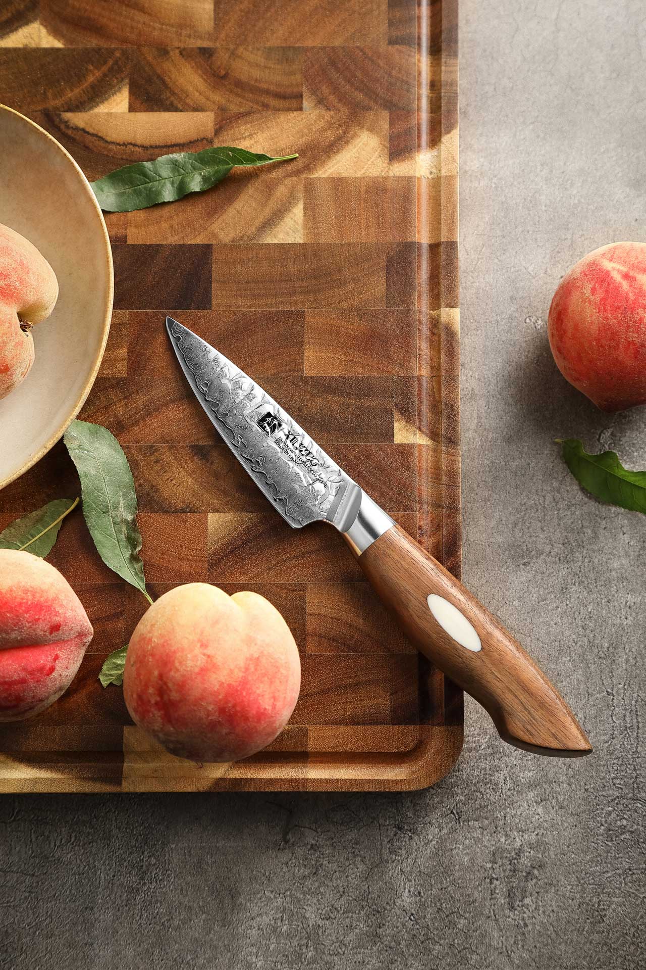 Luxusní ručně vyráběný nůž na loupání XinZuo z řady Jiang B46W s čepelí z věhlasné japonské oceli AUS10 a rukojetí z elegantního ořechového dřeva v dárkové krabičce.