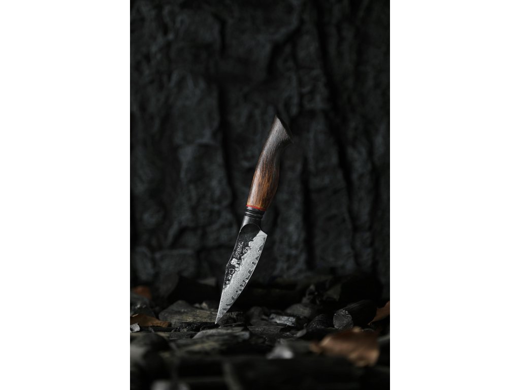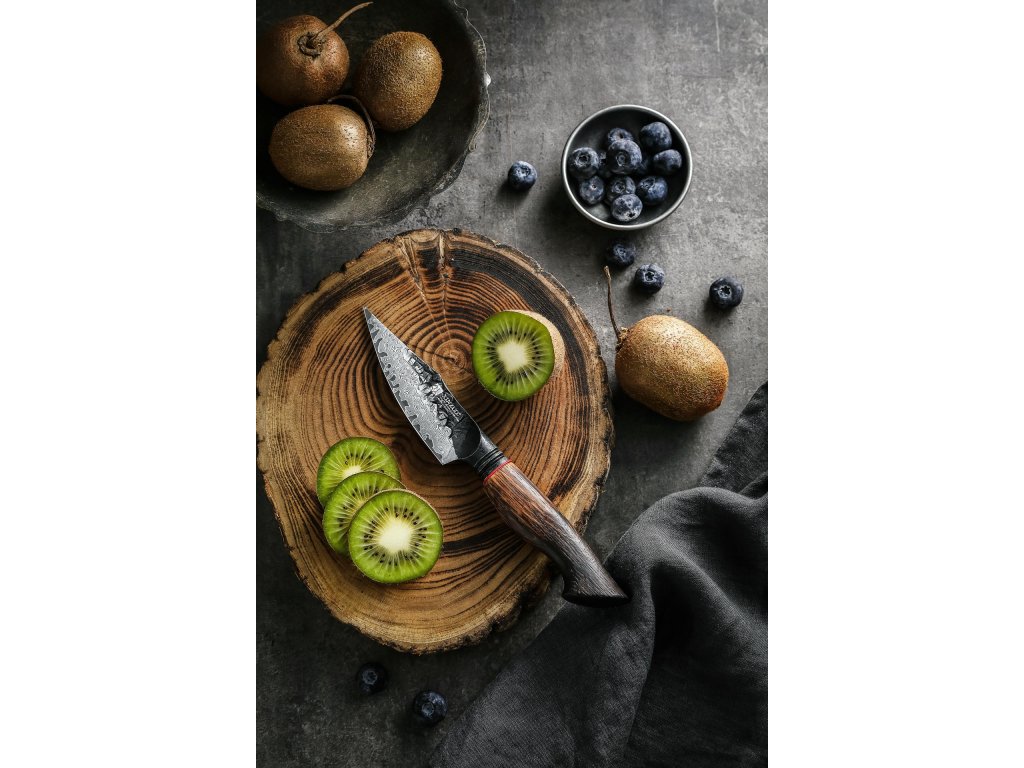 Nůž na loupání XinZuo Mo X06 4" s unikátní damaškovou čepelí a s ručně vyrobenou dubovou rukojetí, která plynule přechází od světlé hřejivé barvy ke kouřově tmavé.