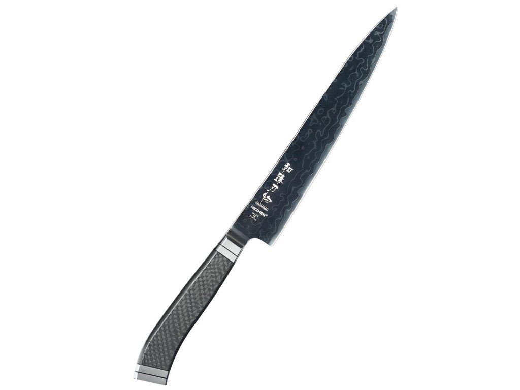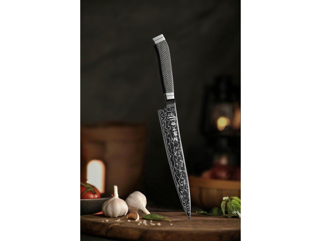 Nůž na maso HezHen Ultimate X10 8,5" s 145vrstvou damaškovou čepelí z práškové oceli BÖHLER M390, DLC povlakem a rukojetí z čistého uhlíkového vlákna. Tvrdost 60±2 HRC.
