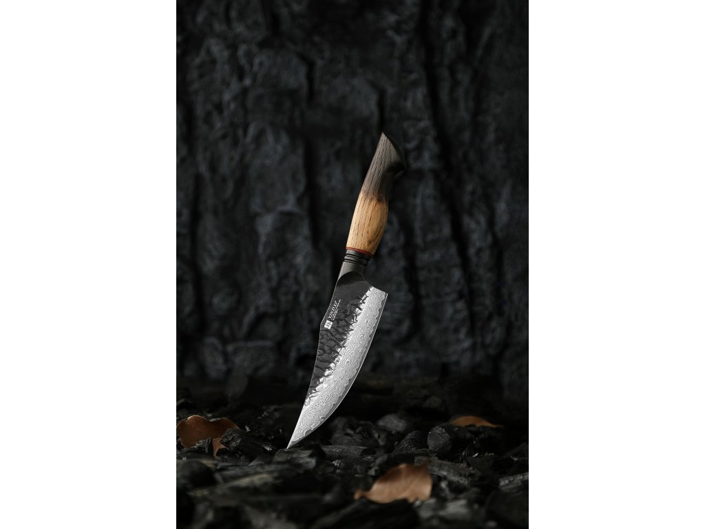Nůž na maso XinZuo Mo X06 5,8" s unikátní damaškovou čepelí a s ručně vyrobenou dubovou rukojetí, která plynule přechází od světlé hřejivé barvy ke kouřově tmavé.