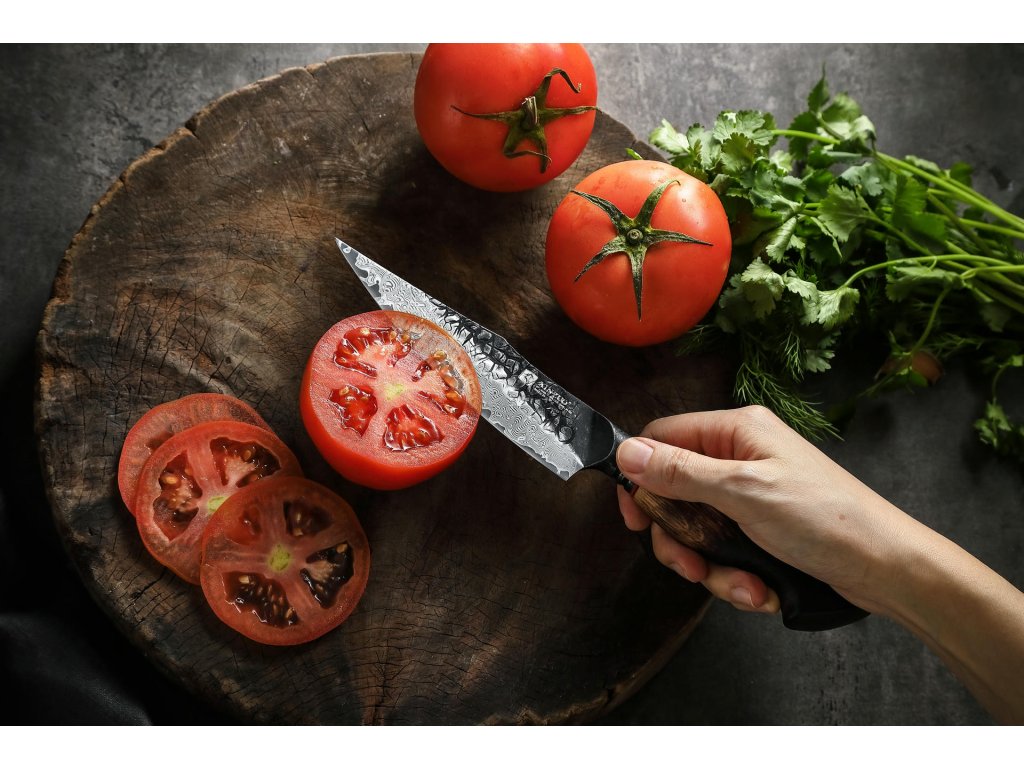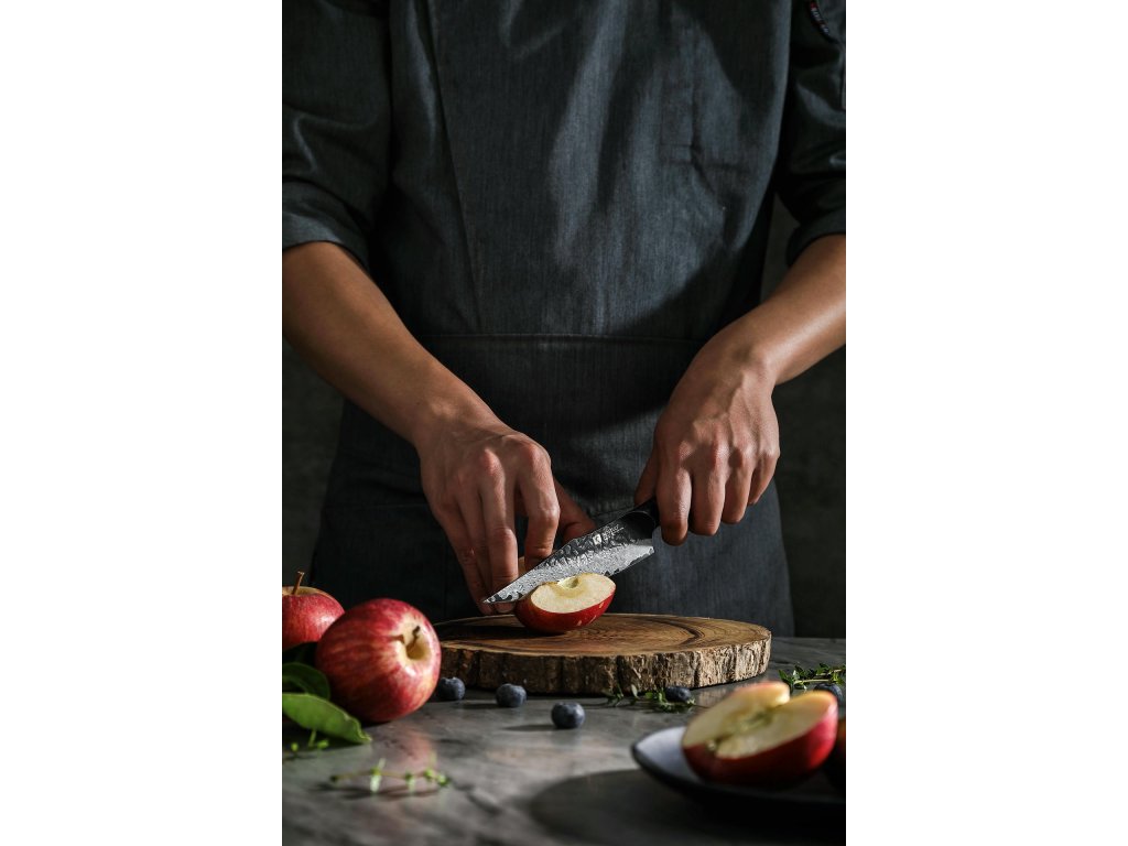 Nůž na ovoce a zeleninu – Detailní krájení bez ztráty šťávy. Tento nůž s krátkou čepelí je navržen pro přesné krájení ovoce a zeleniny. Díky menším rozměrům čepele se s ním snadno manipuluje i u drobnějších surovin. Krájí hladce a přesně, aniž by docházelo k pomačkání, poškození či zbytečné ztrátě šťávy plné vitamínů. S ručně broušeným ostřím našimi mistry nožíři nakrájíte ovoce i zeleninu rychle, efektivně a bez kompromisů.