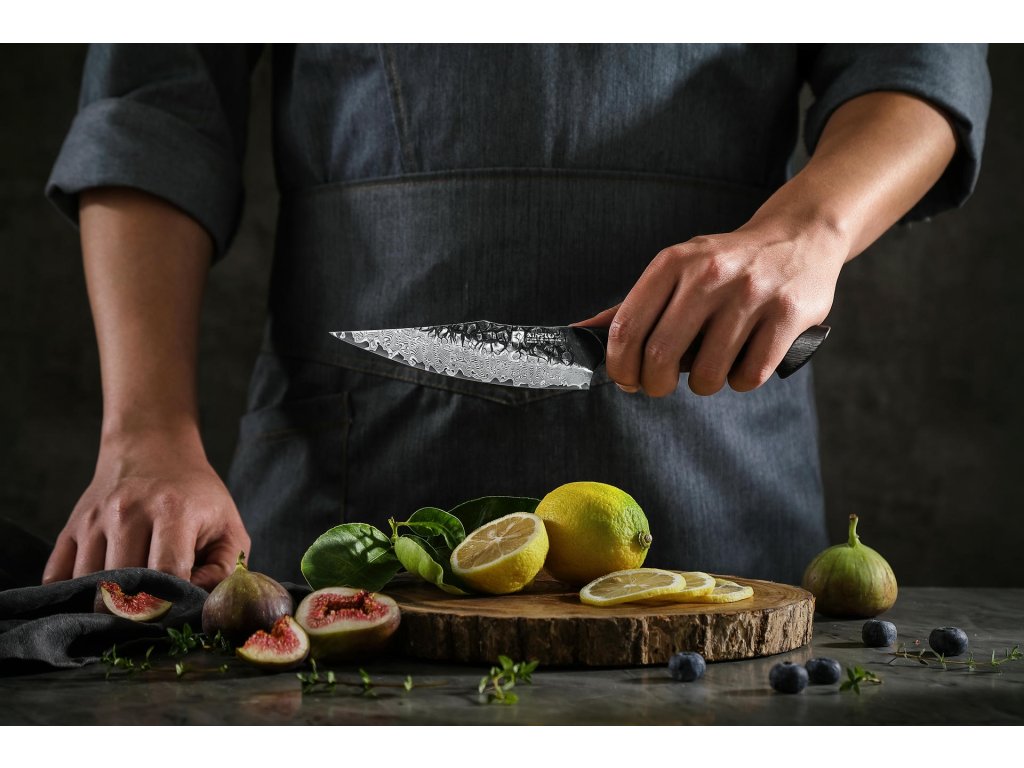 Tento nůž na ovoce a zeleninu je vyroben z prvotřídní damaškové oceli (damascus steel), ze které se vyrábí ty nejlepší nože. Čepel nože s tvrdostí 60±2 Rockwella je vyrobena ze 67 vrstev. Kvalitní ocel spolu s tradiční technikou výroby zajišťuje dlouhou životnost nože. Povrch nože umožňuje dokonalý řez s minimem tření a lepení surovin. Odstín kresby na čepeli se může také lišit, protože každý nůž má skládáním vrstev oceli unikátní vzhled. Nůž je ručně ostřen mistry nožíři pod úhlem 15 ± 1° z obou stran.