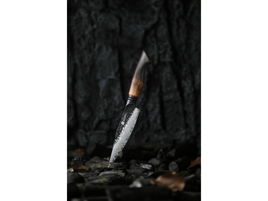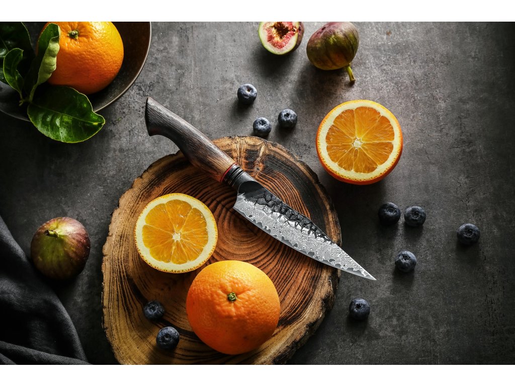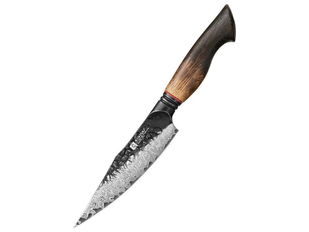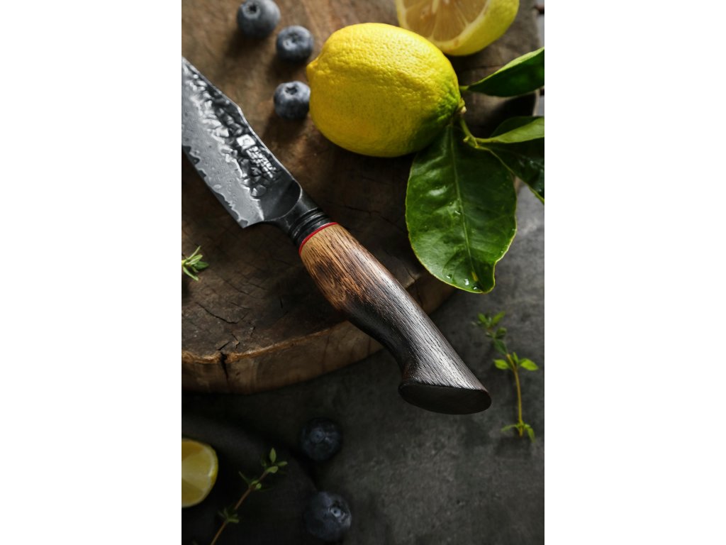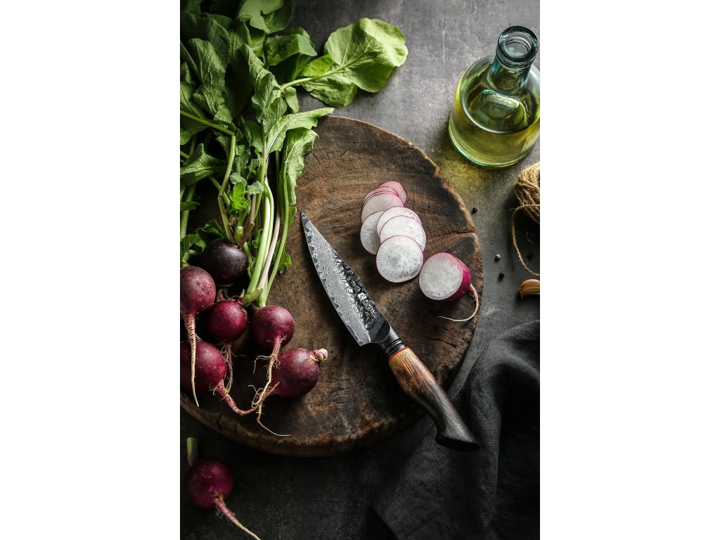 Nůž na ovoce a zeleninu XinZuo Mo X06 5.5" s unikátní damaškovou čepelí a s ručně vyrobenou dubovou rukojetí, která plynule přechází od světlé hřejivé barvy ke kouřově tmavé.