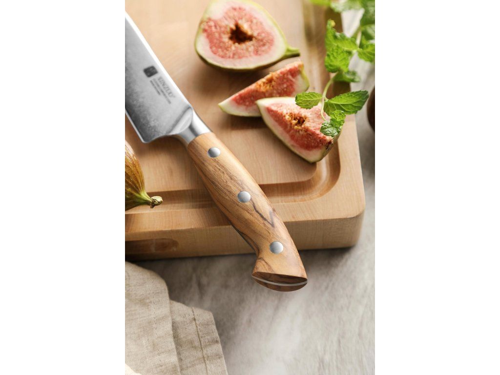 Nůž na ovoce a zeleninu z řady Pin X02O s 3vrstvovou kompozitní ocelí 10Cr15CoMoV (60±2 HRC), povrchovou úpravou stone-wash a rukojetí evropského tvaru z olivového dřeva.