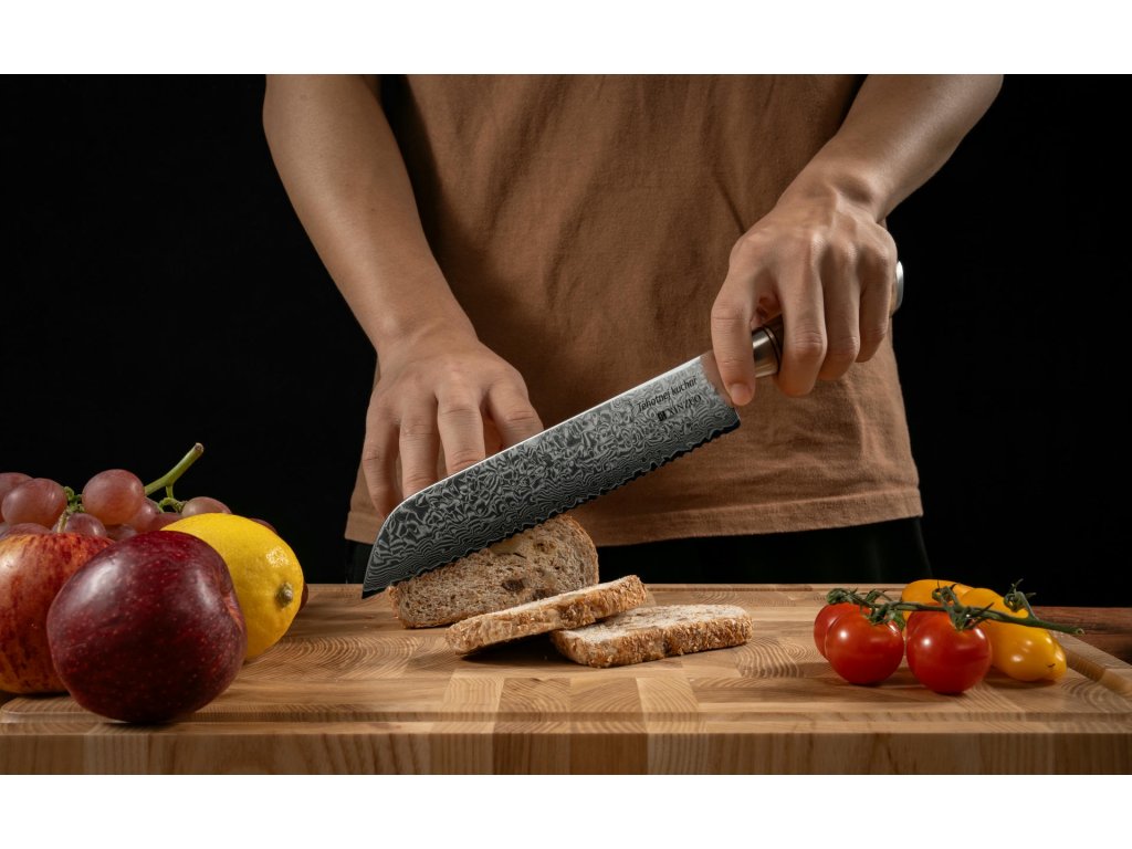 Prémiový nůž na pečivo XinZuo Lan B37 8.5" z řady Těhotnej kuchař je designovým skvostem s damaškovou čepelí a rukojetí z olivového dřeva. Mezi jeho přednosti patří skvělá ergonomie.