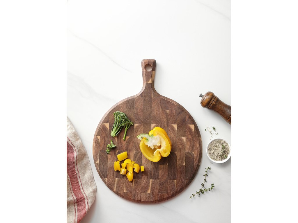 Promyšlené prkénko do posledního detailu. Praktický kulatý tvar je ideální nejen pro krájení, ale i pro servírování surovin. Nechybí ani praktické ucho pro zavěšení prkénka na zeď. Ideální nejen pro skladování, ale také jako designový doplněk vaší kuchyně.