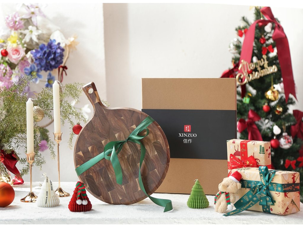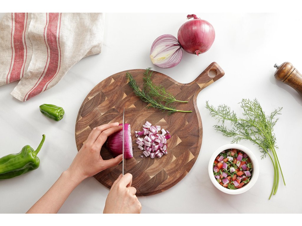 Kvalitní prkénko XinZuo na krájení z akáciového dřeva s kulatým tvarem a praktickým uchem. Povrch prkénka je velmi jemný a šetrný k ostří kuchyňských nožů. Na první pohled vás zaujme svou krásnou texturou. Kvalitní konstrukce prkénka z jednotlivých kusů dřeva zajišťuje jeho pevnost a odolnosti proti opotřebení.
