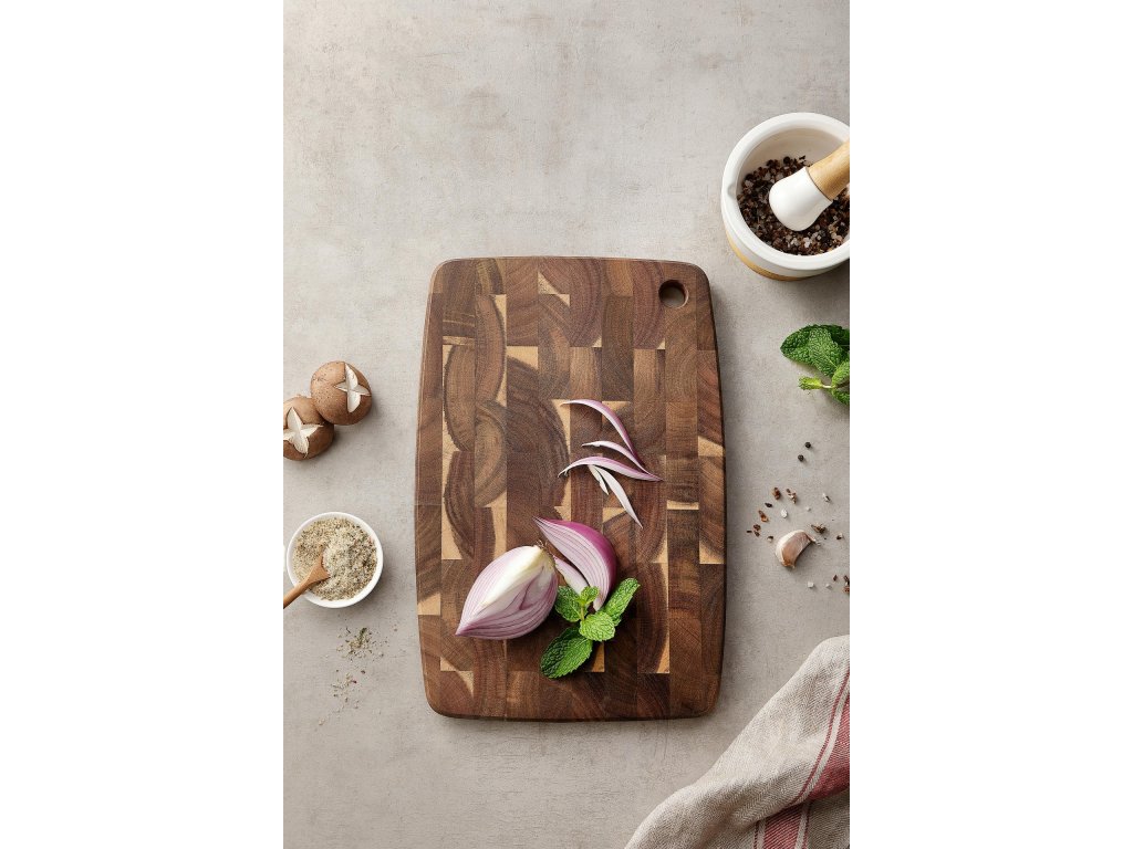Prkénko z akáciového dřeva s elegantním vzhledem End-grain struktury a propracováním do posledního detailu. Bez gumových nožiček.