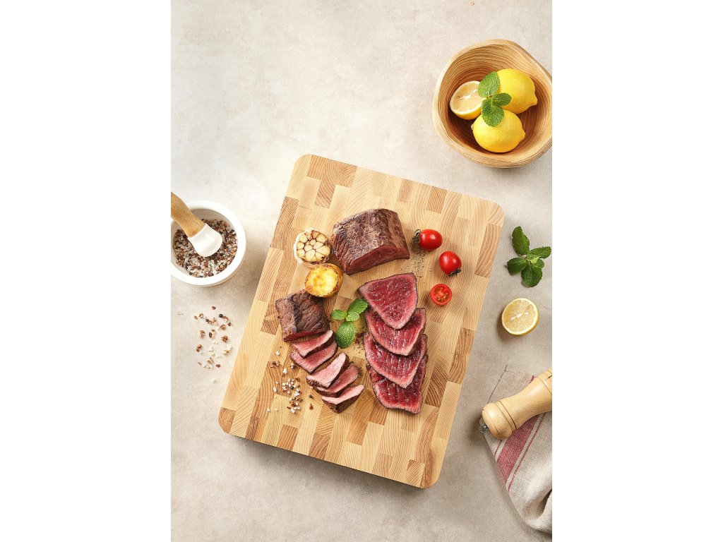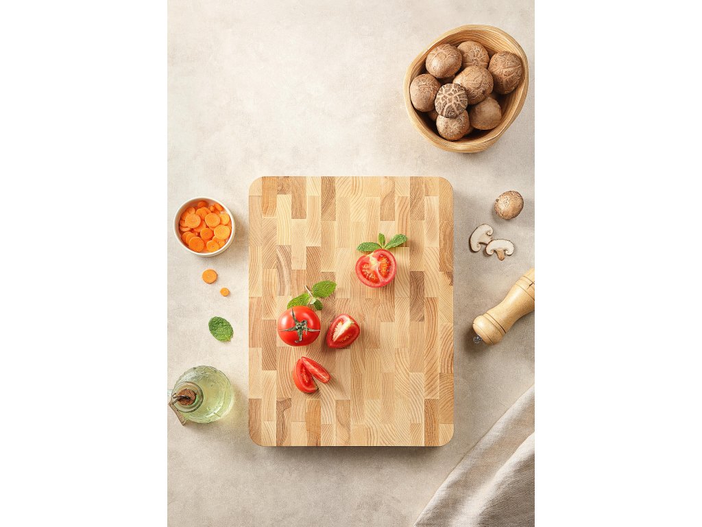 Každé prkénko prochází unikátním více procesovým leštěním, po kterém je povrch velmi hladký, včetně jeho hran. Přírodní povrch umožňuje jeho snadné čištění. Prkénko dosahuje výrazné tloušťky desky 4,2 cm z vysoce kvalitního dřeva, které se jen tak nepoškodí. Technika spojování jednotlivých částí jasanového dřeva vytváří jedinečnou texturu desky. Prkénko nabízí velmi velkou plochu pro krájení surovin s rozměry 41 cm x 31 cm. Váha přibližně 2,98 kg zajišťuje jeho dokonalou stabilitu na pracovní kuchyňské desce. Barva a vzhled prkénka se může oproti produktovým obrázkům mírně lišit z důvodu výroby z jiného kusu jasanového dřeva nebo rozdílným stářím dřeva. Počet špalíků může být odlišný, záleží na konkrétním kusu dřeva, ze kterého vyrábíme, tak aby nevznikal zbytečně velký odpad.