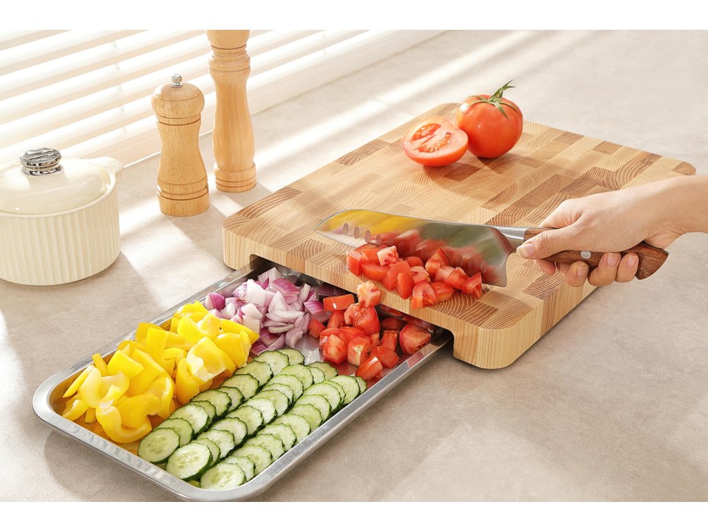 Tip: Boční výřezy neslouží pouze pro přenášení prkénka, ale i pro praktické umístění kovového tácu pro odkládání nakrájených surovin.