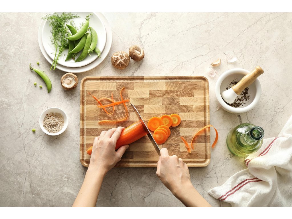 - Šetrné k ostří nožů: Nože zůstávají déle ostré než při používání prkének z jiných materiálů.