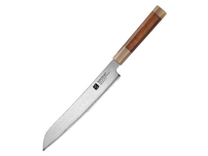Luxusní nůž na pečivo XinZuo Zhen X05Z s 8" čepelí, vytvořenou mistrnou ruční prací z japonské oceli a s tradiční osmihrannou rukojetí, dodávaný v elegantní dřevěné krabičce.