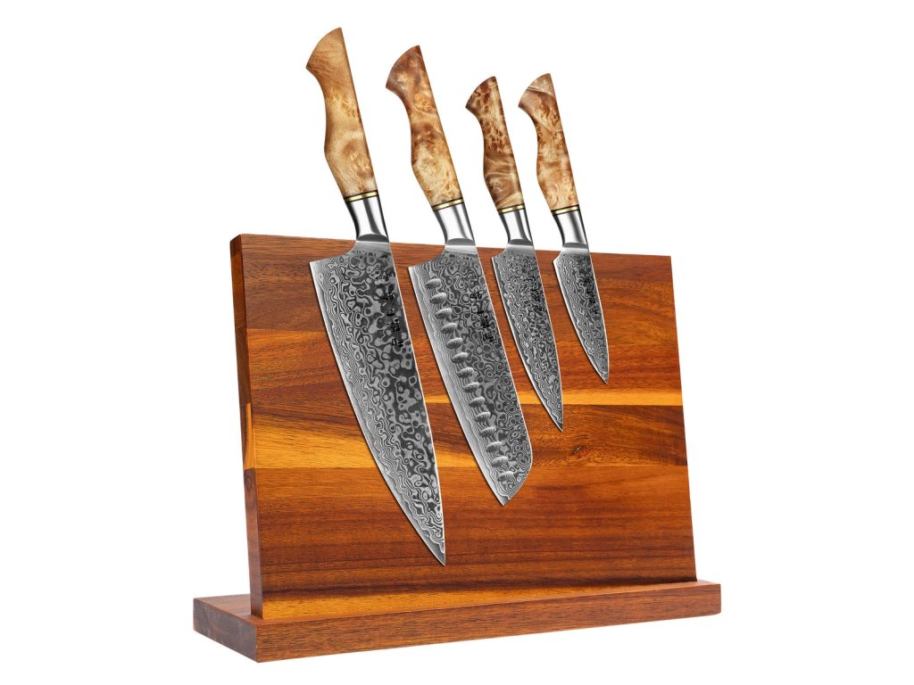 Sada čtyř kuchyňských nožů HezHen Master B30 z damaškové oceli s ergonomickou dřevěnou rukojetí, včetně příslušenství v podobě dřevěného magnetického stojánku.