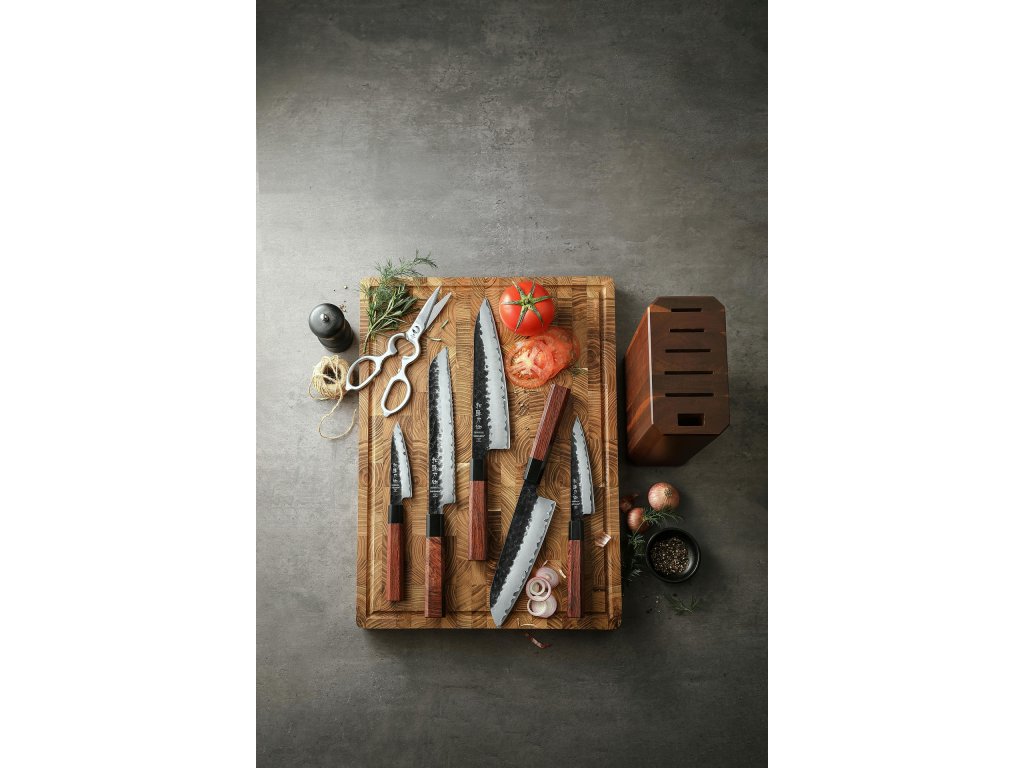Nože v sadě: | Santoku, Šéfkuchařský, Na ovoce a zeleninu, Loupací, Na pečivo |
