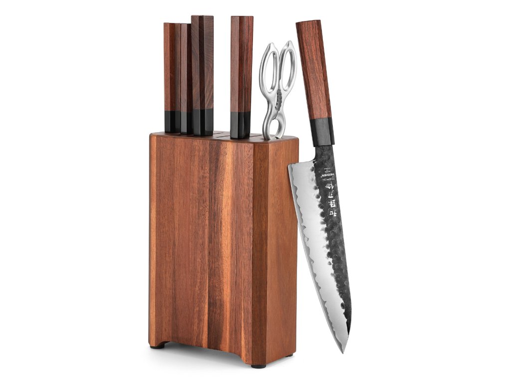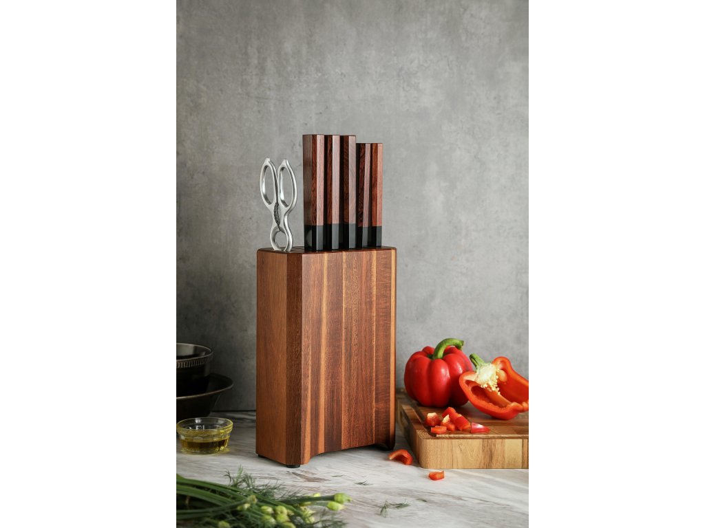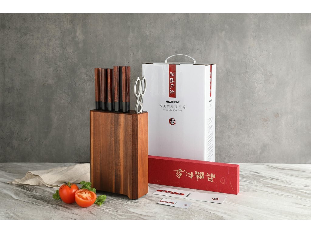 Sada nožů HEZHEN obsahuje nože z řady PM8S pocházející z tradičního čínského města nožů Yangjiang, ve kterém se vyrábí ty nejlepší nože celá staletí. Místní mistři si své umění výroby a opracování nožů předávají z generace na generaci. Nože v této sadě patří mezi exkluzivní nože od výrobce XinZuo, které se svou unikátností zasloužily o prodej pod vlastní značkou HEZHEN, jejíž název znamená HE = harmonie a ZHEN = perfektní. Ve volném překladu lze HEZHEN označovat jako značku nožů s dokonalou harmonií. Nože HEZHEN PM8S rozpoznáte na první pohled od ostatních nožů XinZuo nejen podle jiného názvu značky, ale i jedinečného designu čepele a tradiční ergonomické rukojeti v japonském oktagonálním stylu. XinZuo při výrobě této sady nožů HEZHEN využívá to nejlepší z moderní a tradiční výroby nožů. Každý nůž od výrobce XinZuo je jedinečný, díky závěrečnému preciznímu ručnímu opracování. Set nožů HEZHEN PM8S obsahuje nejen prémiové nože, ale i elegantní stojan typu blok, který svým přírodním vzhledem zapadne takřka do každé kuchyně. Součástí jsou i praktické porcovací nůžky nejen na drůbež.