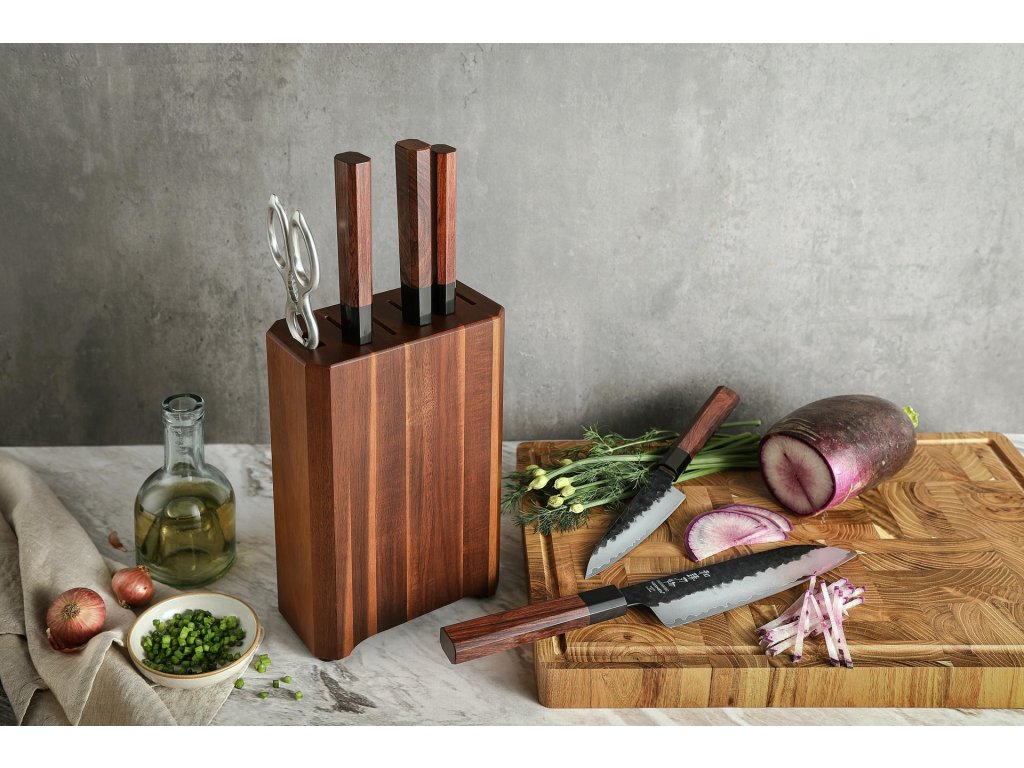 - Santoku nůž – Japonská preciznost v každém řezu. Santoku patří mezi nejpopulárnější japonské nože díky své všestrannosti a ikonickému designu. díky své všestrannosti a ikonickému designu. Široká čepel s precizně nabroušeným ostřím si hravě poradí s krájením ovoce, zeleniny i masa, přičemž zajišťuje maximální kontrolu a přesnost řezu. Díky rozměrům čepele je Santoku ideální i pro snadné přenášení nakrájených surovin přímo do hrnce či na pánev. Skvělá volba pro každého, kdo hledá do své kuchyně všestranný nůž s japonskou elegancí.