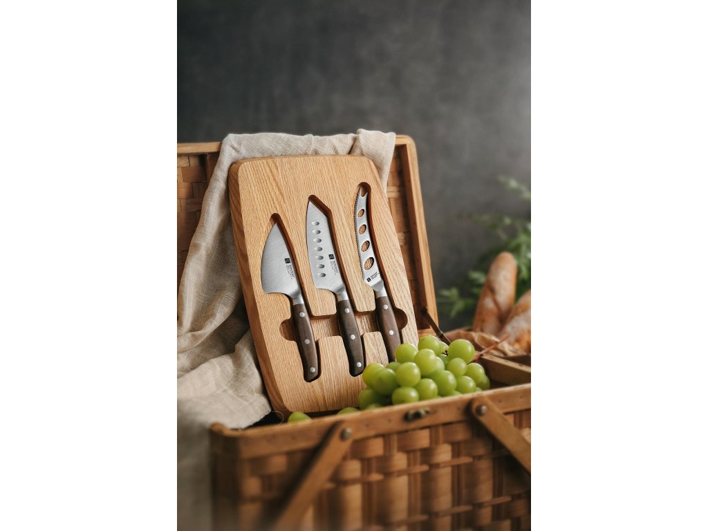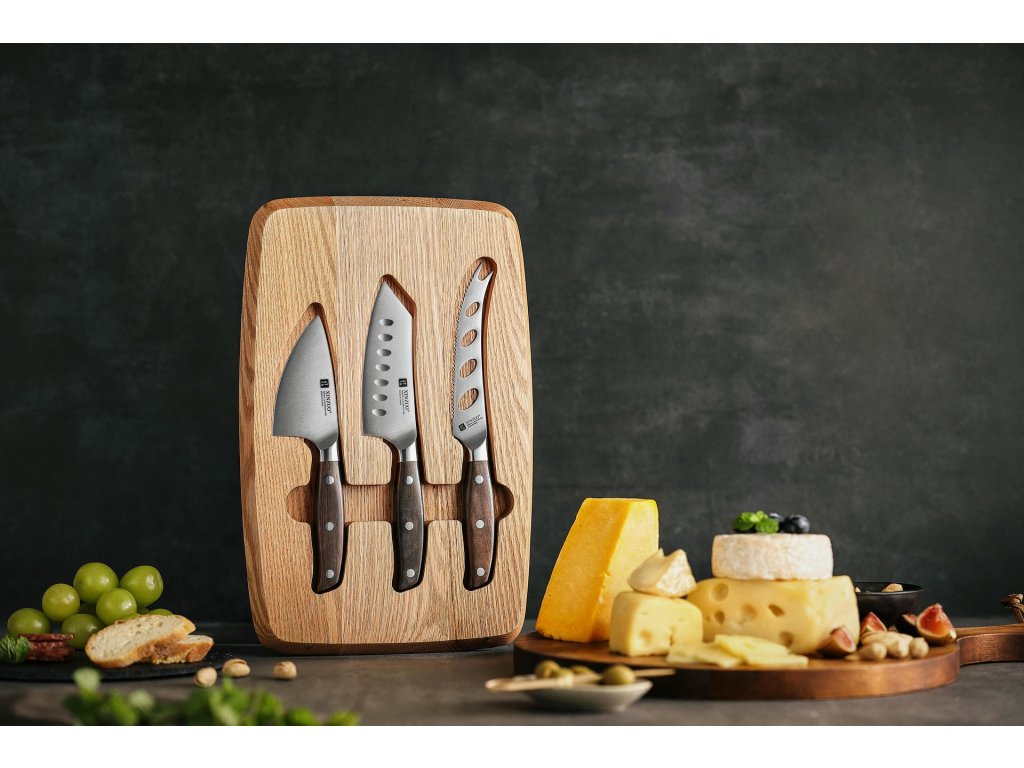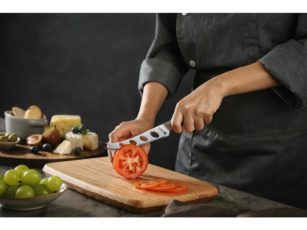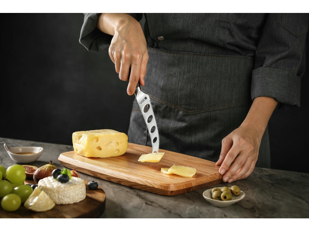 - 5" nůž na měkké sýry (soft cheese) – se speciálně uzpůsobenou čepelí s děrováním, které zabraňuje přilepování sýra během krájení. Vidlicové zakončení čepele usnadňuje nabírání nakrájeného sýra bez nutnosti použití dalšího kuchyňského náčiní.