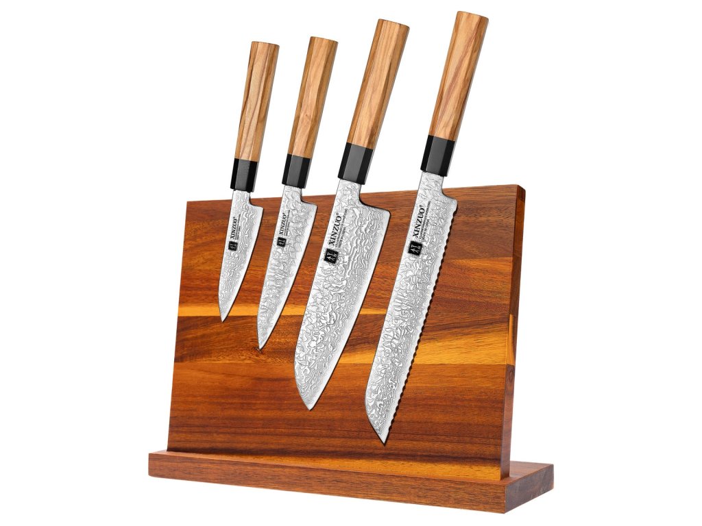 Sada čtyř nožů XinZuo Zhen PM8O z damaškové oceli s magnetickým stojánkem. Nože mají tradiční japonský tvar rukojeti z olivového dřeva s rohem vodního buvola.