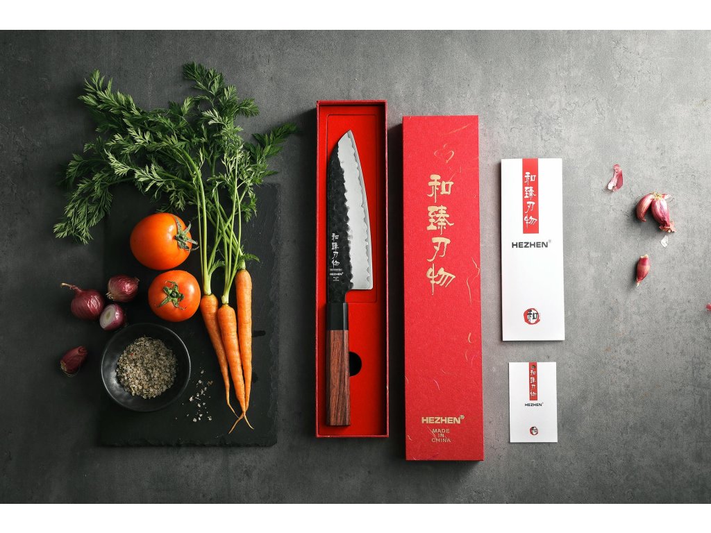 Santoku nůž HEZHEN PM8S 7" je zabalen v luxusní dárkové krabičce v červené barvě, se kterou je ideálním praktickým dárkem do domácnosti. Vhodný jako dárek ke svatbě, kolaudaci nového bydlení, narozeninám, jakékoliv sváteční události či běžné návštěvě. Svým luxusním vzhledem dárková krabička i v ní obsažený elegantní nůž HEZHEN s tradiční rukojetí od výrobce XinZuo udělají radost každému obdarovanému.