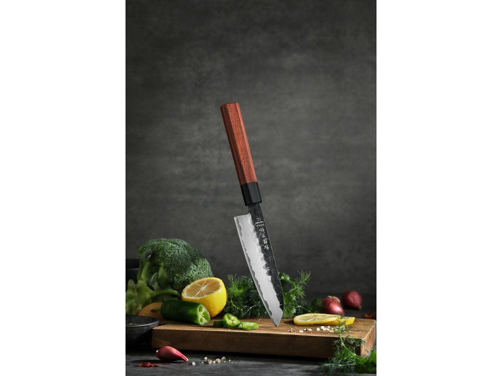 Santoku nůž – Japonská preciznost v každém řezu. Santoku patří mezi nejpopulárnější japonské nože díky své všestrannosti a ikonickému designu. Široká čepel s precizně nabroušeným ostřím si hravě poradí s krájením ovoce, zeleniny i masa, přičemž zajišťuje maximální kontrolu a přesnost řezu. Díky rozměrům čepele je Santoku ideální i pro snadné přenášení nakrájených surovin přímo do hrnce či na pánev. Skvělá volba pro každého, kdo hledá do své kuchyně všestranný nůž s japonskou elegancí.