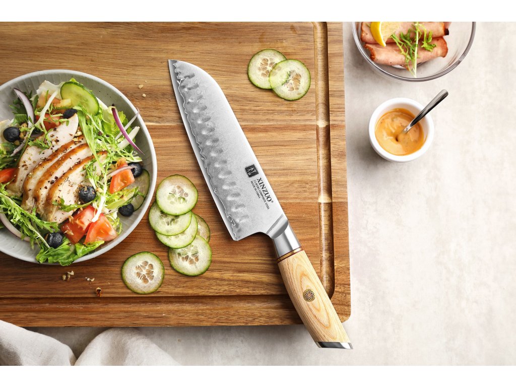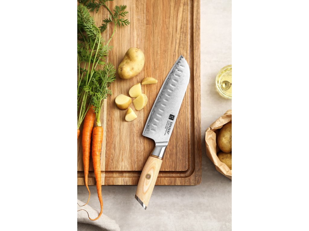 Prémiový santoku nůž XinZuo Lan B37S 7" z řady Těhotnej kuchař je designovým skvostem s čepelí z kompozitní oceli, rukojetí z Pakkawood a skvělou ergonomií.