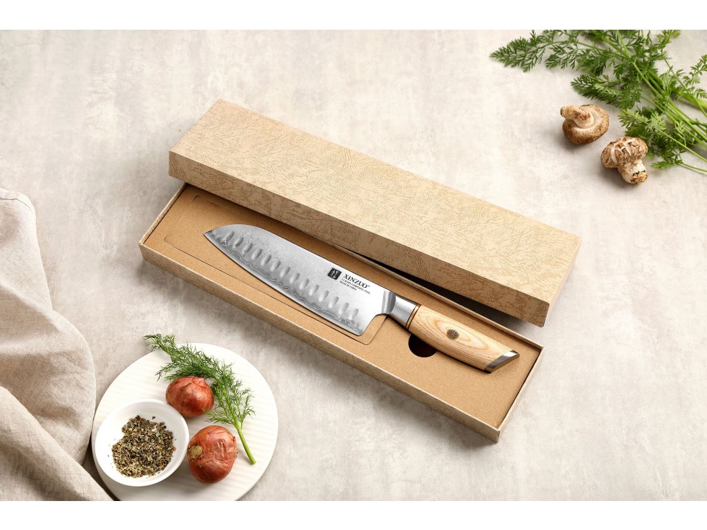 Santoku nůž XinZuo Lan B37S 7" je zabalen v elegantní ekologické krabičce, se kterou je ideálním praktickým dárkem do domácnosti. Krabička této řady nožů je založena na ekologických materiálech a šetrnosti k životnímu prostředí. S jednotným elegantním vzhledem. Kvalitní nůž od výrobce XinZuo v takovéto krabičce udělá radost každému obdarovanému.