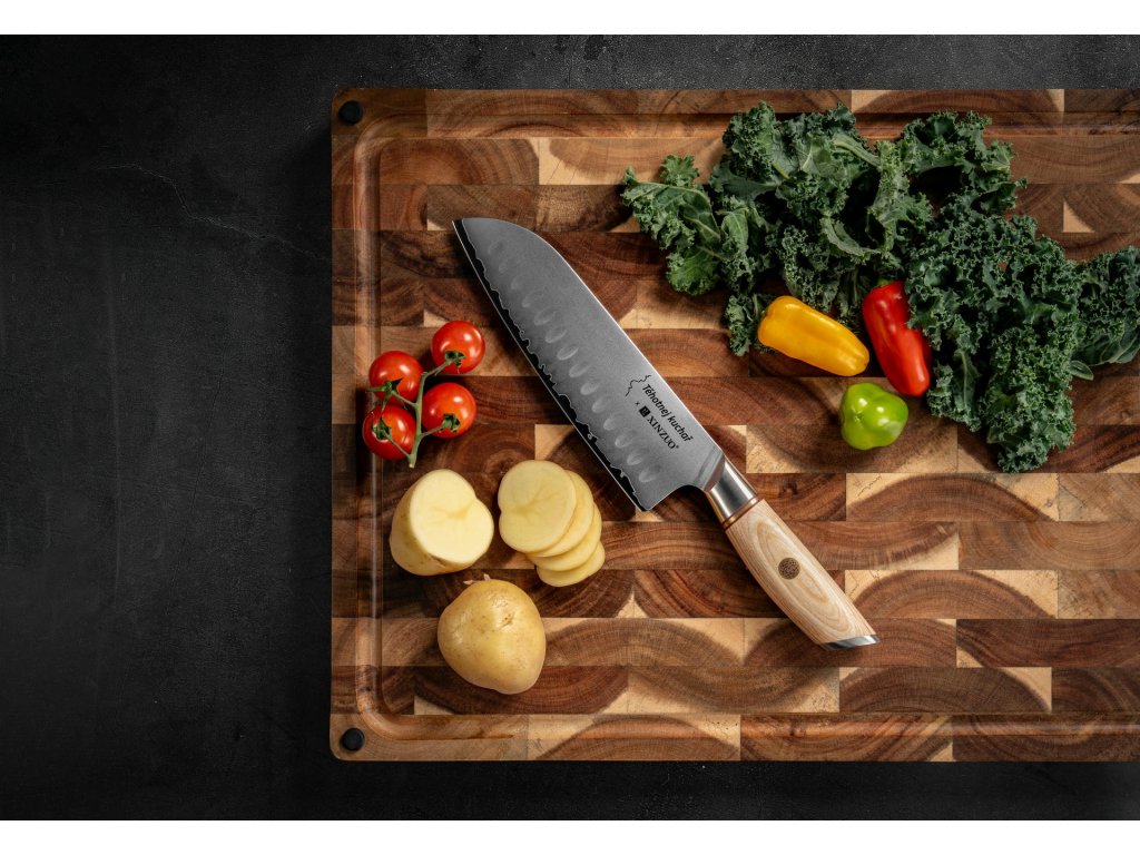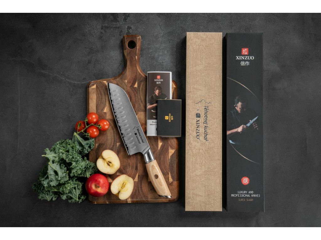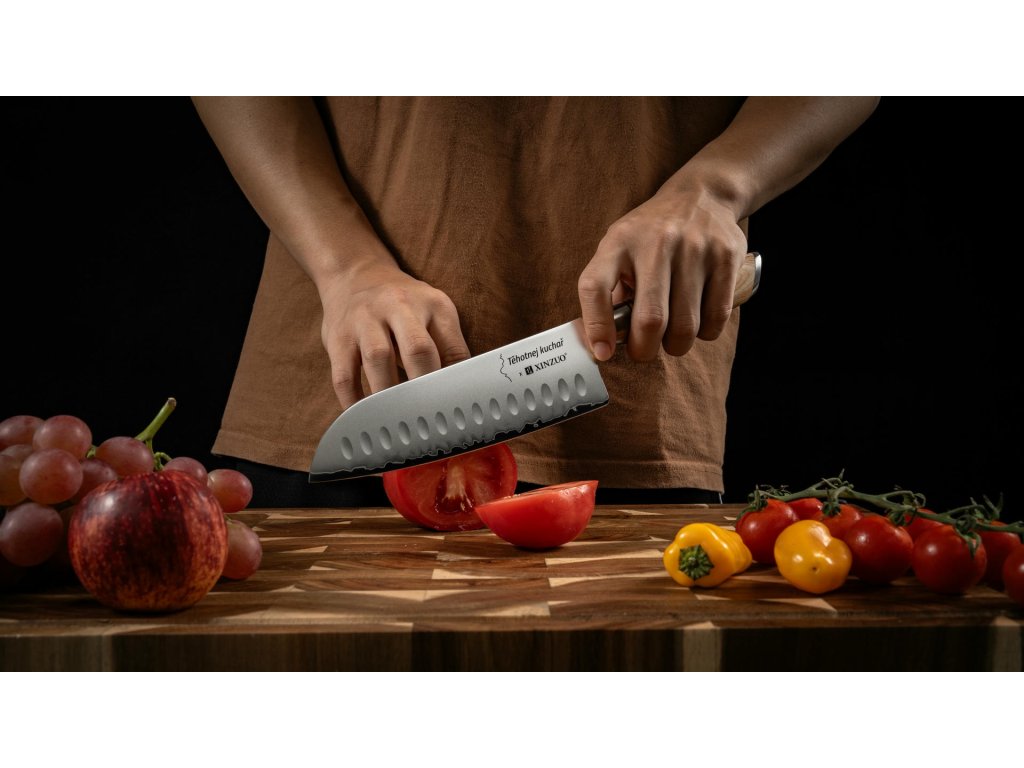 - Ve spolupráci s Těhotným kuchařem jsme připravili speciální řadu kuchyňských nožů, do které spadá i tento nůž santoku.