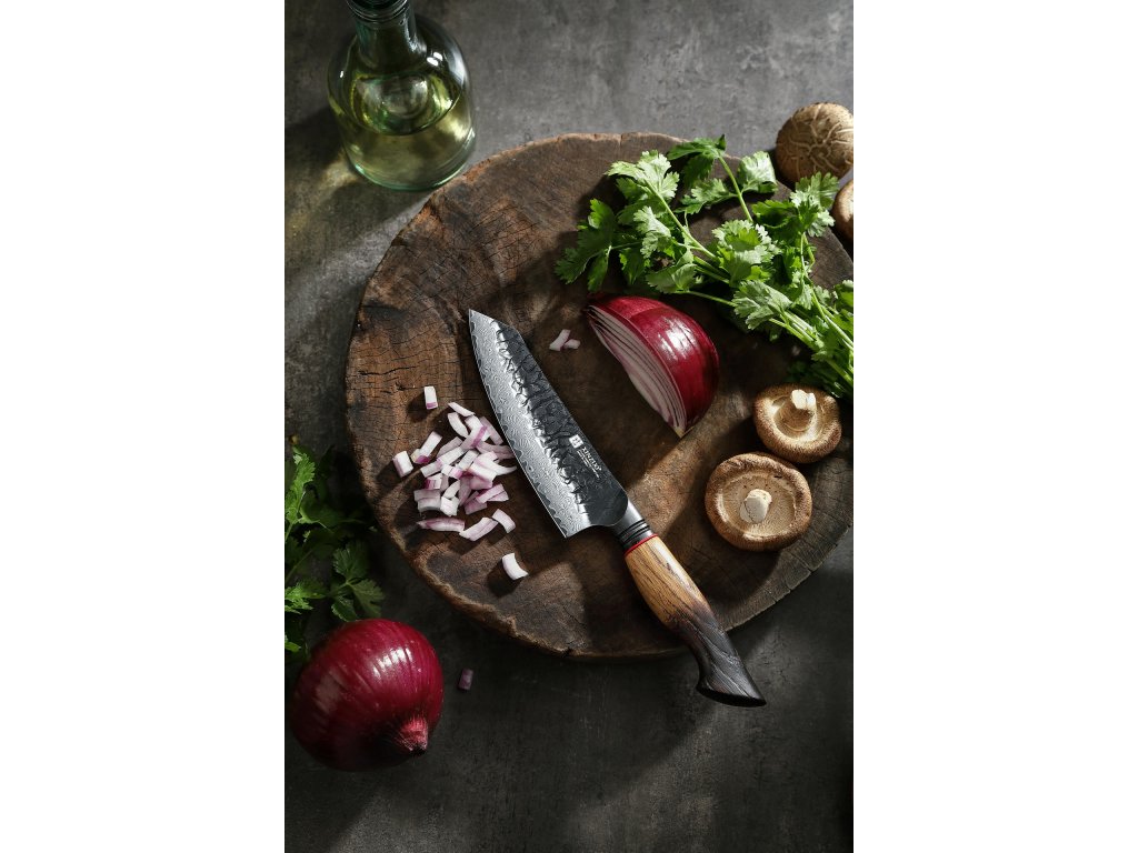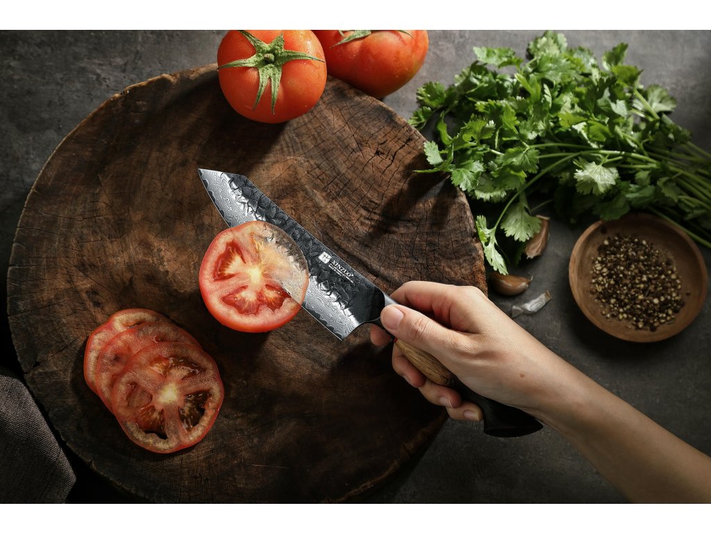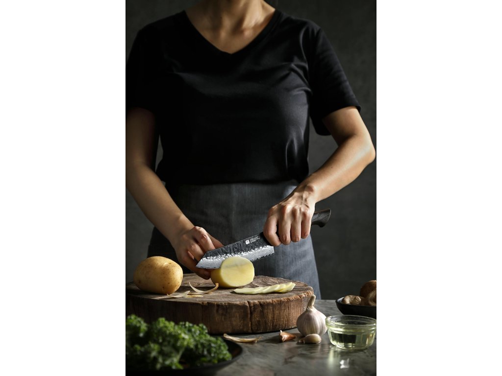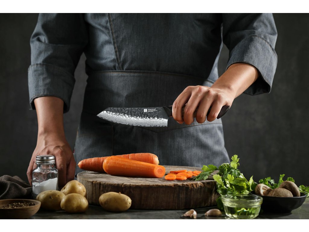 Santoku nůž – Japonská preciznost v každém řezu. Santoku patří mezi nejpopulárnější japonské nože díky své všestrannosti a ikonickému designu. díky své všestrannosti a ikonickému designu. Široká čepel s precizně nabroušeným ostřím si hravě poradí s krájením ovoce, zeleniny i masa, přičemž zajišťuje maximální kontrolu a přesnost řezu. Díky rozměrům čepele je Santoku ideální i pro snadné přenášení nakrájených surovin přímo do hrnce či na pánev. Skvělá volba pro každého, kdo hledá do své kuchyně všestranný nůž s japonskou elegancí.
