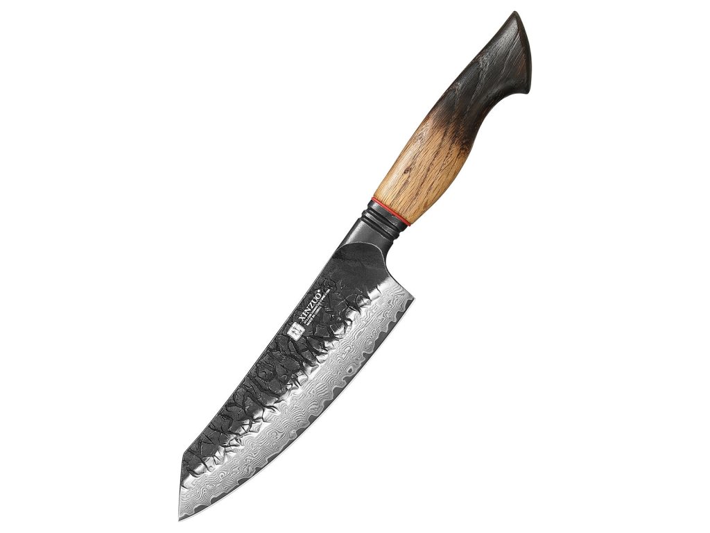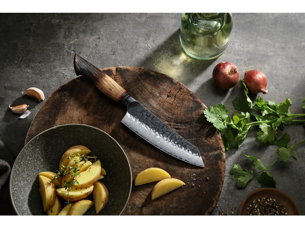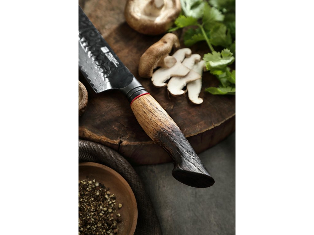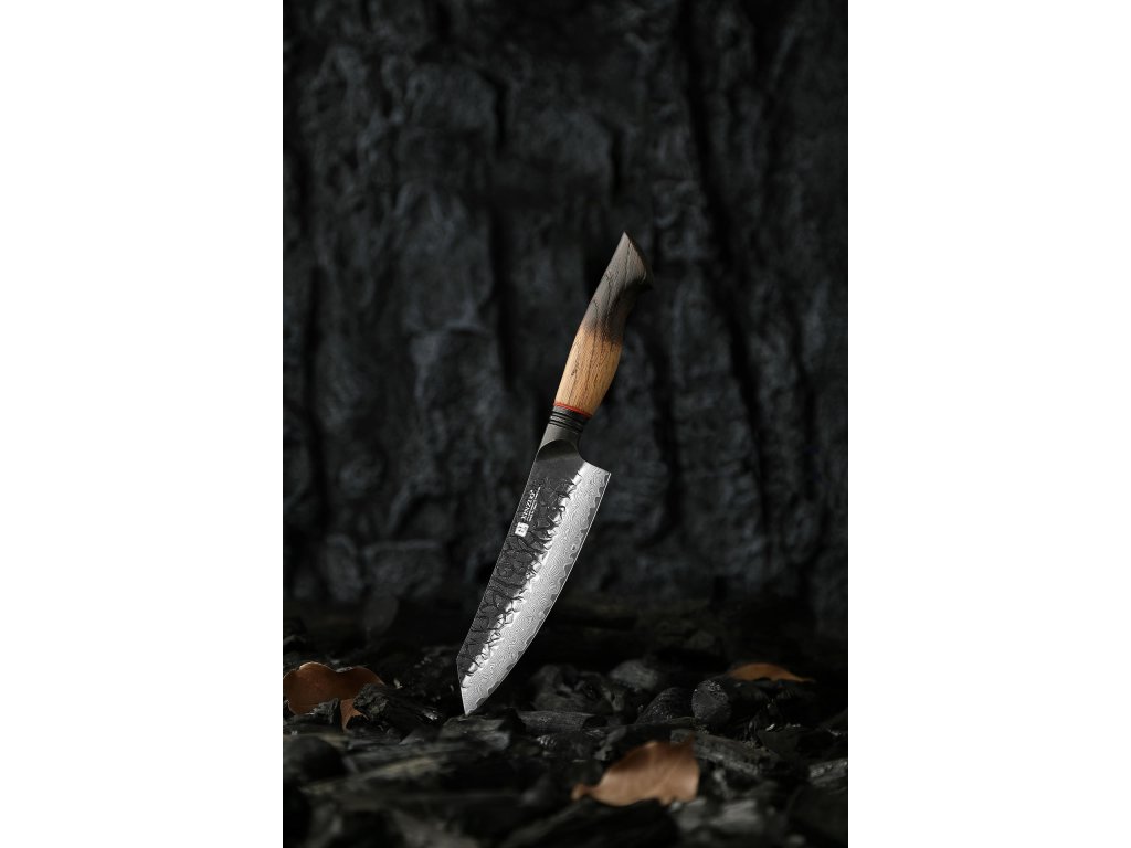 Malý Santoku nůž XinZuo Mo X06 5,5" s unikátní damaškovou čepelí a s ručně vyrobenou dubovou rukojetí, která plynule přechází od světlé hřejivé barvy ke kouřově tmavé.