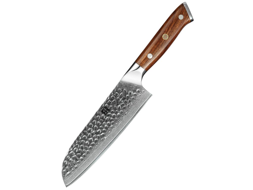 Ručně vyráběný santoku nůž XinZuo Yu B13D s 7" čepelí z damaškové oceli a kvalitní dřevěnou rukojetí z Ironwood.
