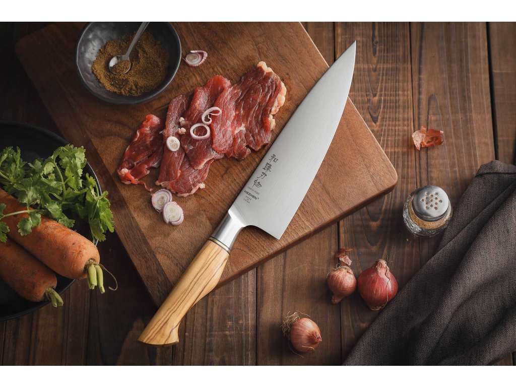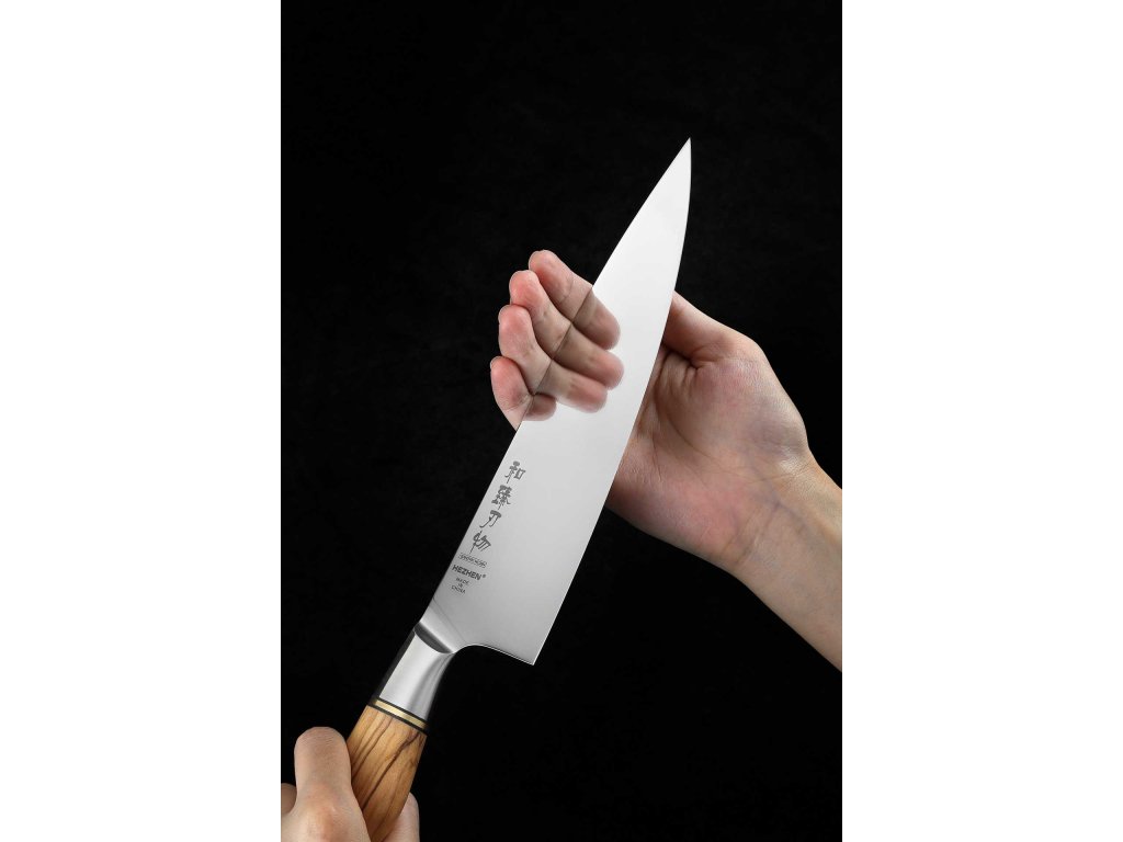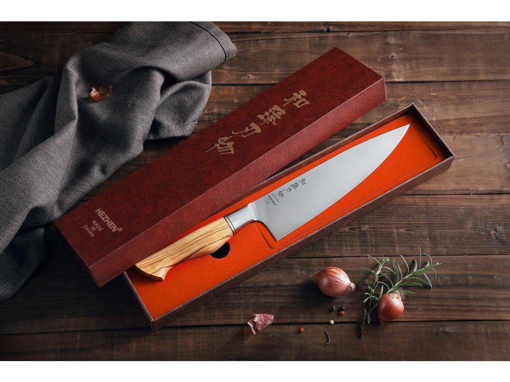Šéfkuchařský nůž HEZHEN Master B30S s 8" velkou čepelí z kvalitní švédské oceli Sandvik 14C28N a přírodní dřevěnou rukojetí z olivového dřeva.