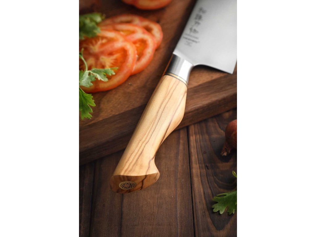 Rukojeť nože je vyrobena z olivového dřeva pocházejícího z Itálie a oslní na první pohled přírodním vzhledem. Přírodní vzhled rukojeti je vyladěn do posledního detailu díky několikanásobnému ručnímu leštění pro zvýraznění přirozené textury olivového dřeva. Eleganci rukojeti dodává i decentní měděný mosazný nýt s květinovým vzorem. Rukojeť je nejen hezká, ale především její tvar je uzpůsoben pro maximální ergonomii a pevný pohodlný úchop i při déle trvajícím soustavném krájení. Barva a vzhled materiálu rukojeti nože se může oproti produktovým obrázkům mírně lišit z důvodu výroby rukojeti z jiného kusu dřeva nebo rozdílným stářím dřeva.