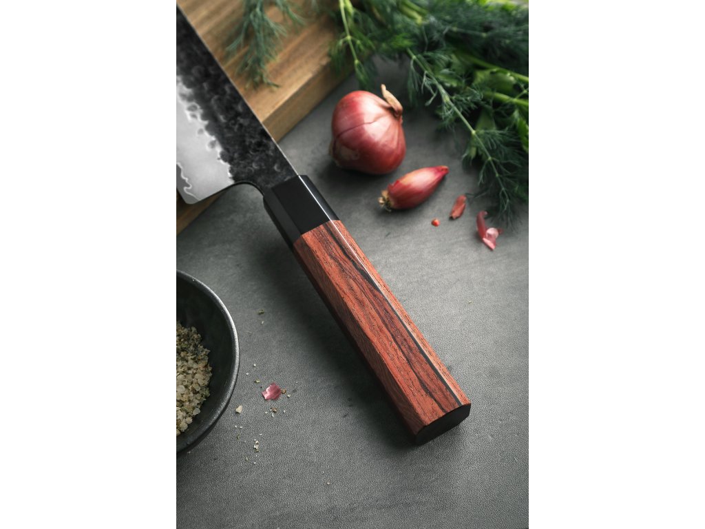 Vzhled rukojeti nože HEZHEN z řady PM8S se nese ve stejném retro stylu, jako jeho čepel. S tradičním retro tvarem v japonském stylu, je navržena s důrazem na ergonomii a pro pohodlný úchop i při dlouhodobém držení s dokonalým vyvážením. Díky léty prověřenému oktagonálnímu tvaru je tento nůž vhodný pro pohodlné krájení levou i pravou rukou. Rukojeť je vyrobena z kvalitního Rosewood dřeva, které je známé svou tvrdostí. V čase neměkne, nepraská a nevybledne. Nůž je navržen pro každodenní používání s dlouhou životností nejen čepele, ale i rukojeti. Barva a vzhled materiálu rukojeti nože se může oproti produktovým obrázkům mírně lišit z důvodu výroby rukojeti z jiného kusu dřeva nebo rozdílným stářím dřeva.