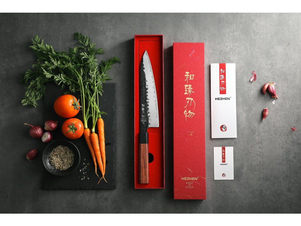 Šéfkuchařský nůž HEZHEN PM8S 8,3" je zabalen v luxusní dárkové krabičce v červené barvě, se kterou je ideálním praktickým dárkem do domácnosti. Vhodný jako dárek ke svatbě, kolaudaci nového bydlení, narozeninám, jakékoliv sváteční události či běžné návštěvě. Svým luxusním vzhledem dárková krabička i v ní obsažený elegantní nůž HEZHEN s tradiční rukojetí od výrobce XinZuo udělají radost každému obdarovanému.