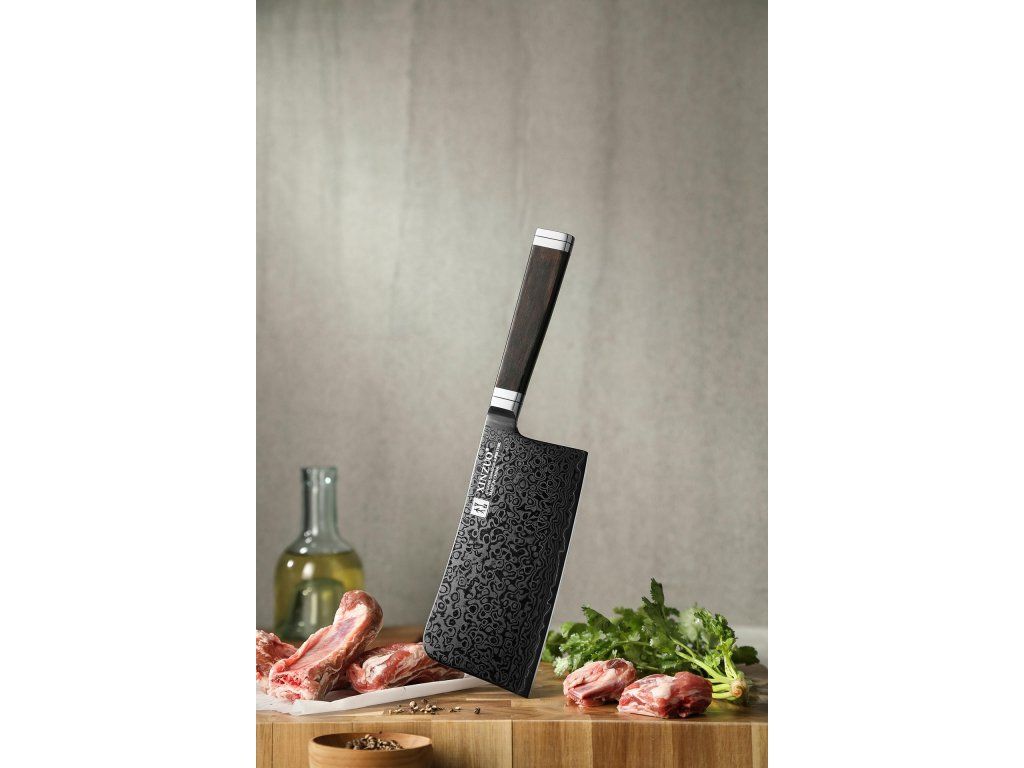 Elegantní sekáček z řady Ji X08E s 67vrstvou damaškovou čepelí, černým titanovým povlakem (PVD) a čtyřhrannou rukojetí z tmavého ebenového dřeva.