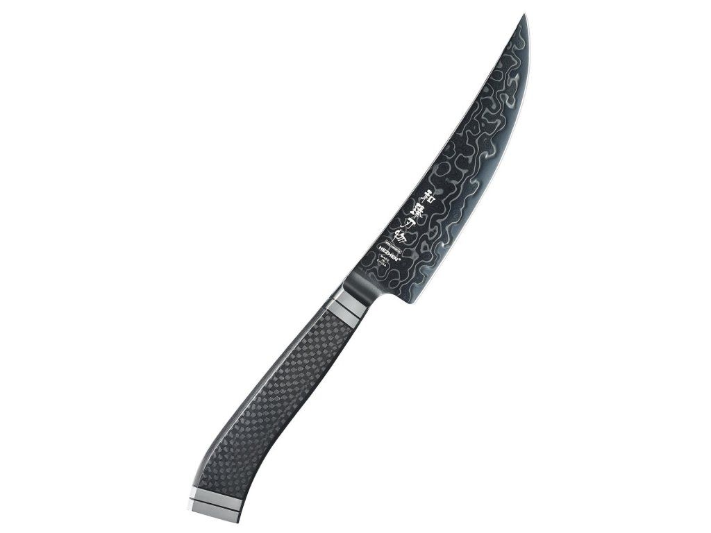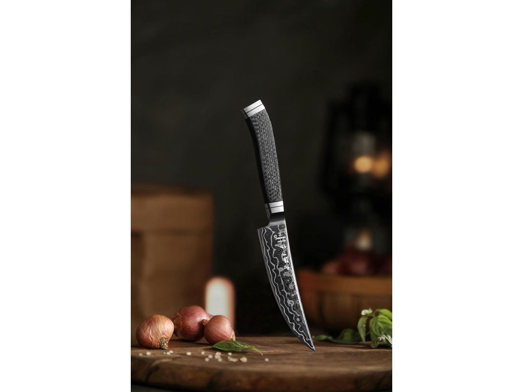 Steakový nůž HEZHEN Ultimate X10 5" s 145vrstvou damaškovou čepelí z práškové oceli BÖHLER M390, DLC povlakem a rukojetí z čistého uhlíkového vlákna. Tvrdost 60±2 HRC.