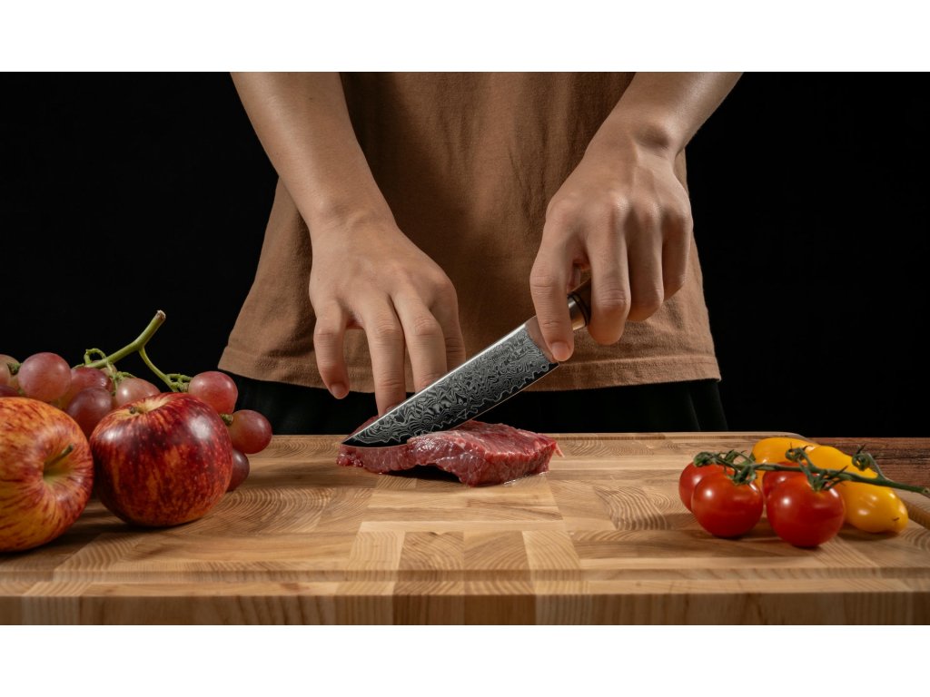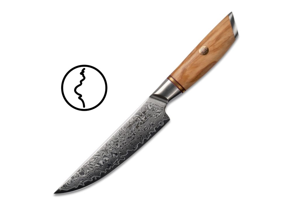Prémiový steakový nůž XinZuo Lan B37 5" z řady Těhotnej kuchař je designovým skvostem s damaškovou čepelí a rukojetí z olivového dřeva.