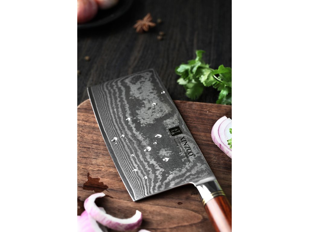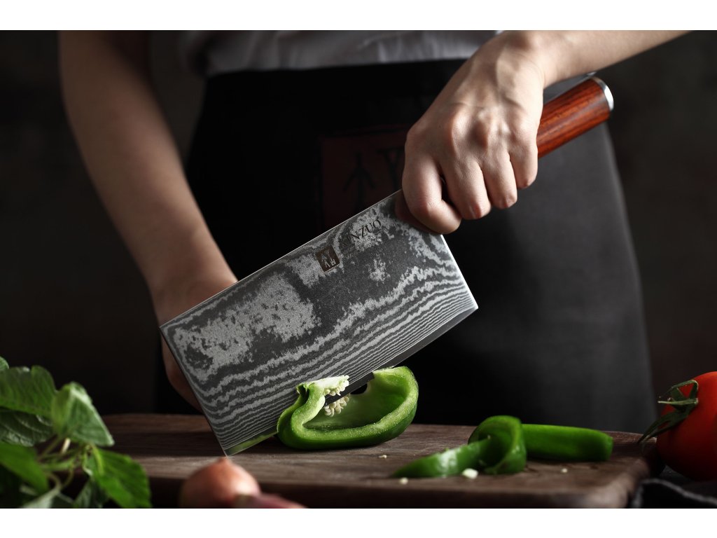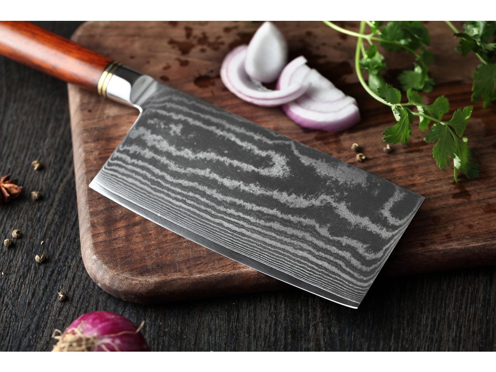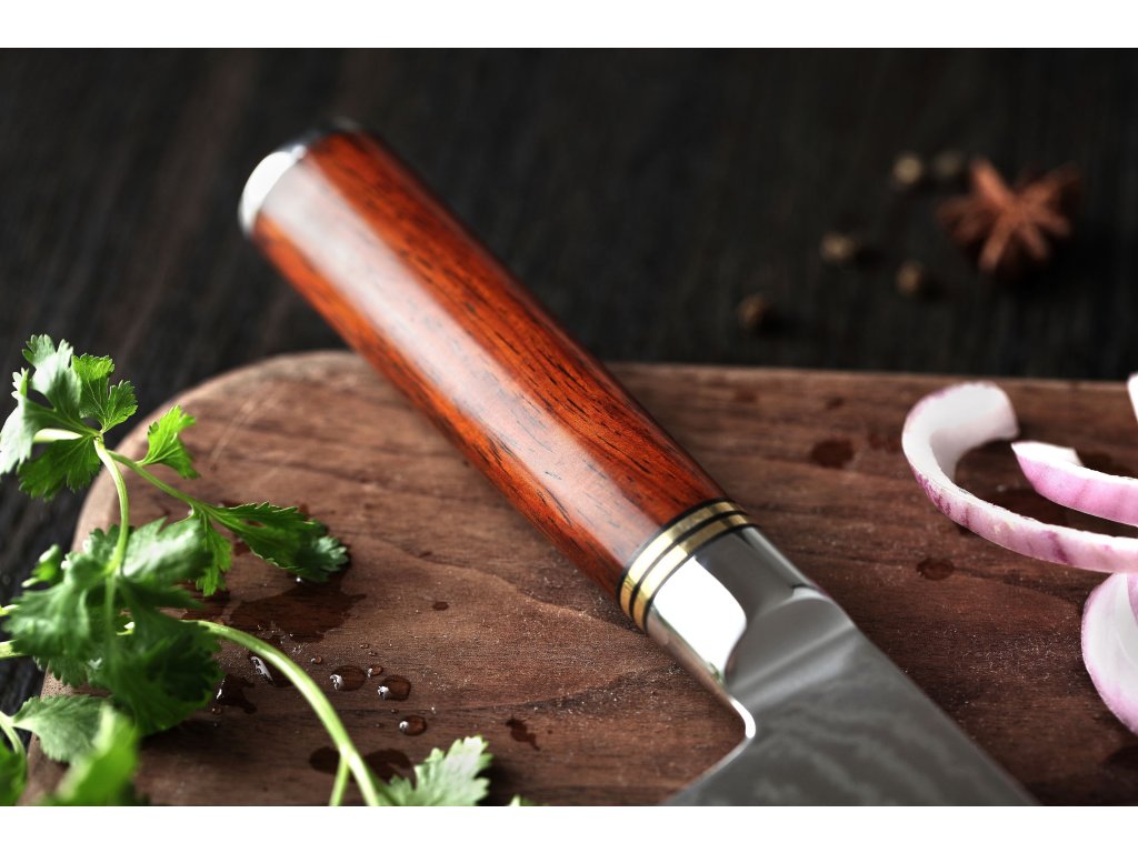 Čínský nůž TAO XinZuo He B1R 7" s univerzálním využitím, čepelí z kvalitní damaškové oceli a ručně opracovaným ostřím.