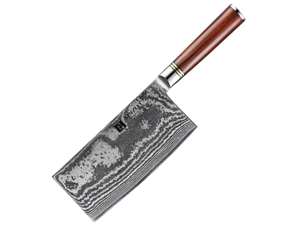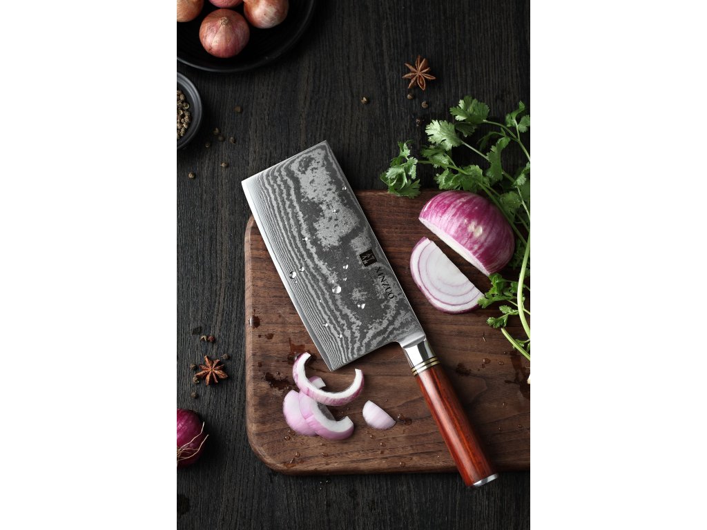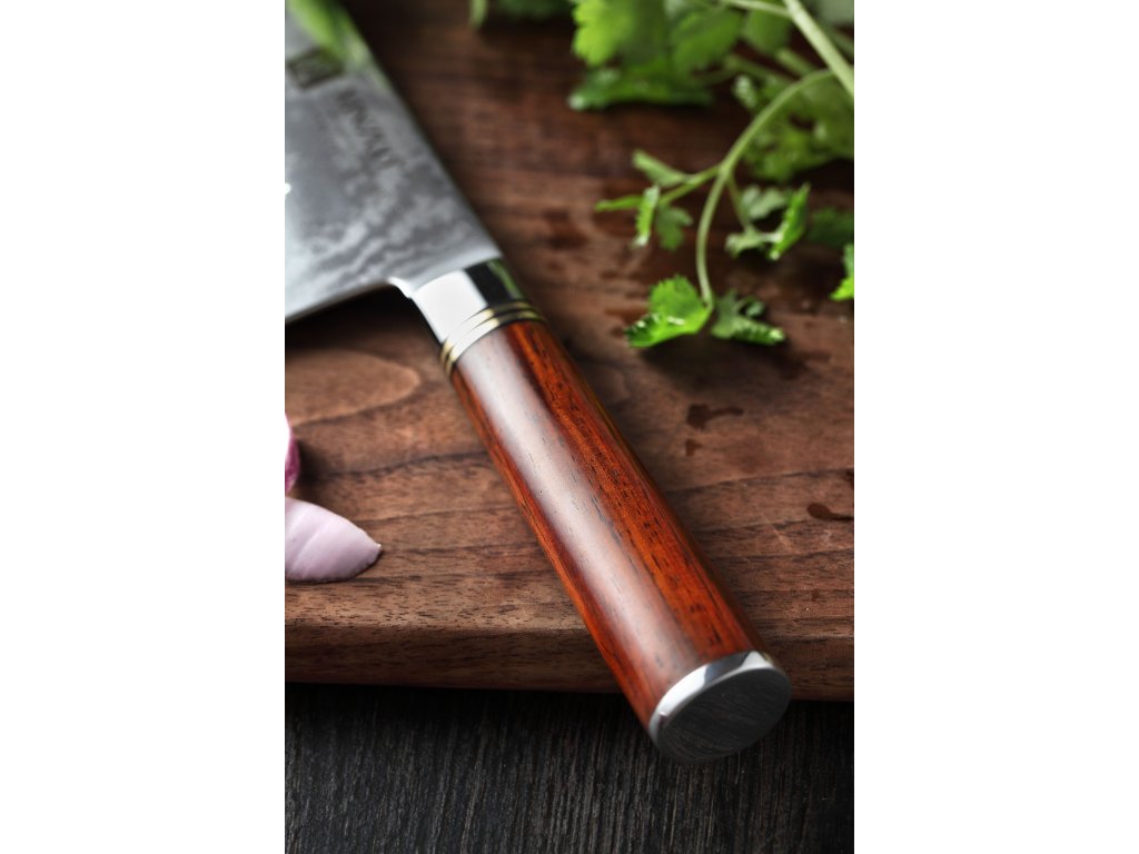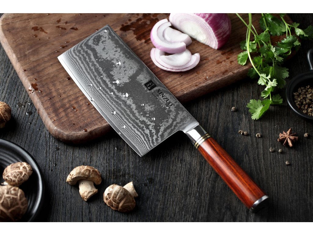 Čínský nůž TAO XinZuo He B1R 7" s univerzálním využitím, čepelí z kvalitní damaškové oceli a ručně opracovaným ostřím.