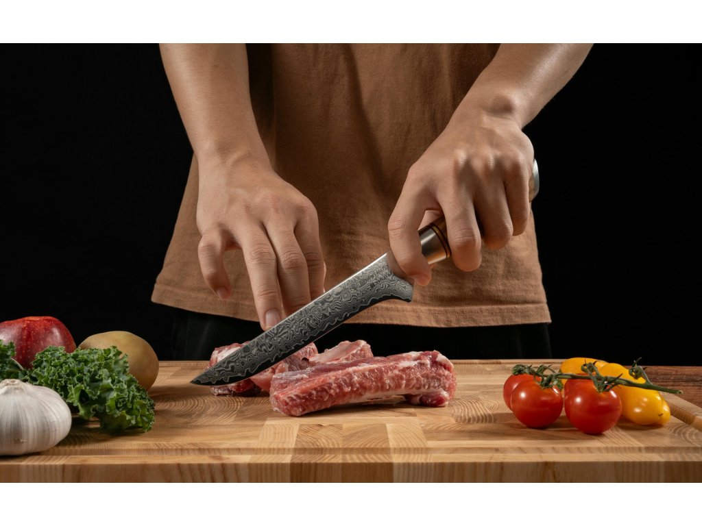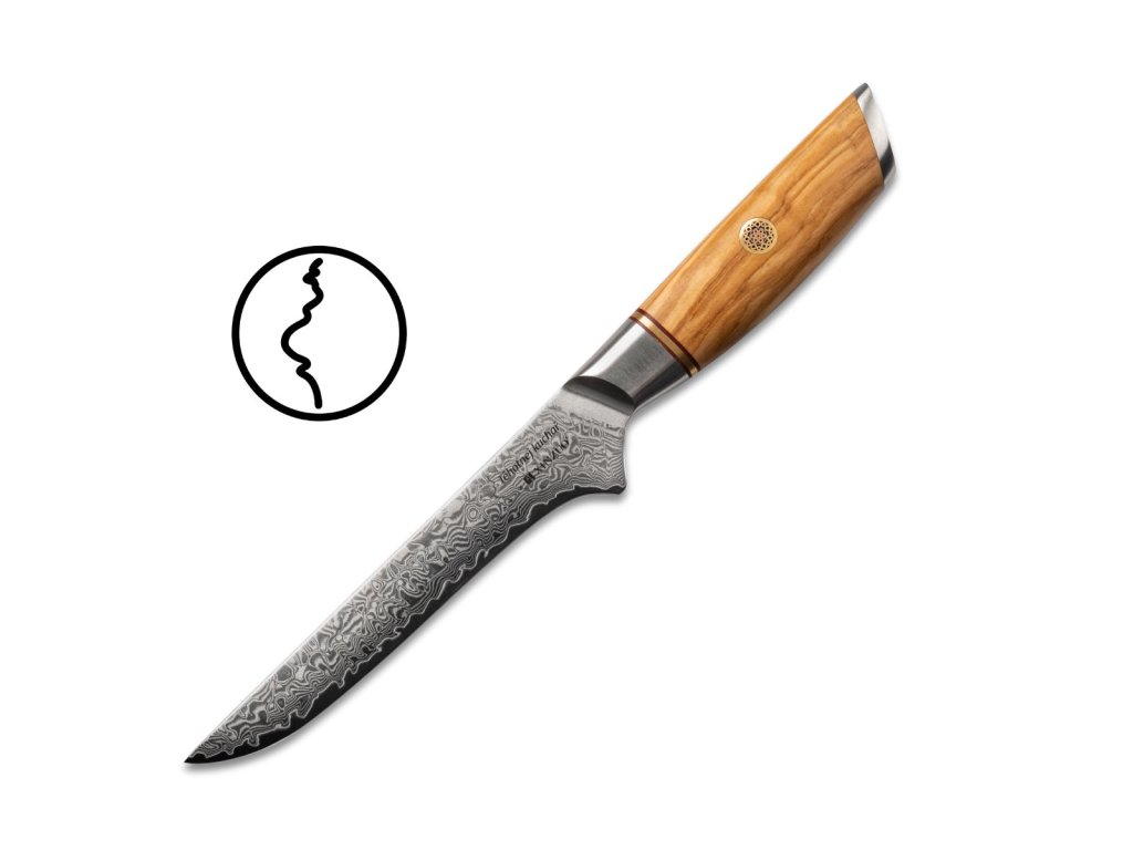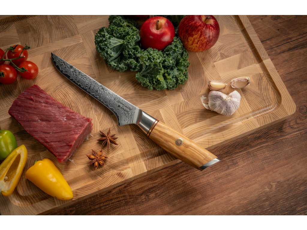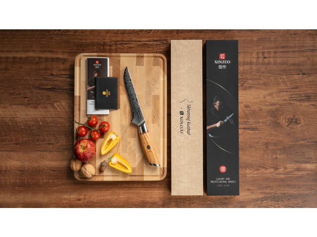 Prémiový vykosťovací nůž XinZuo Lan B37 6" z řady Těhotnej kuchař je designovým skvostem s damaškovou čepelí a rukojetí z olivového dřeva. Mezi jeho přednosti patří skvělá ergonomie.